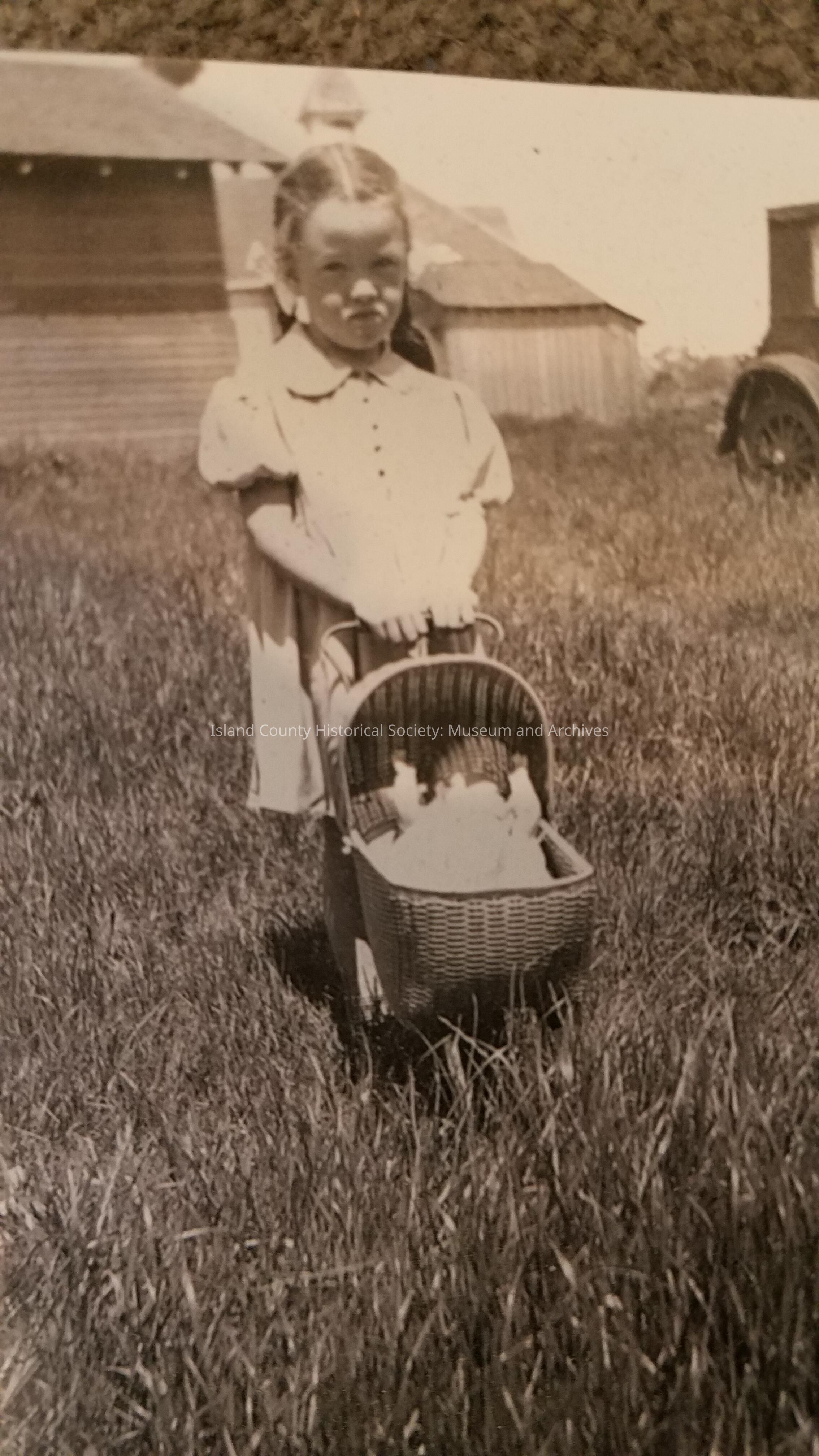 Doll Buggy and doll circa late 1920's early 1930's. Belonged to Helene Schock Munroe of Oak Harbor Photo of Helene with the doll and buggy