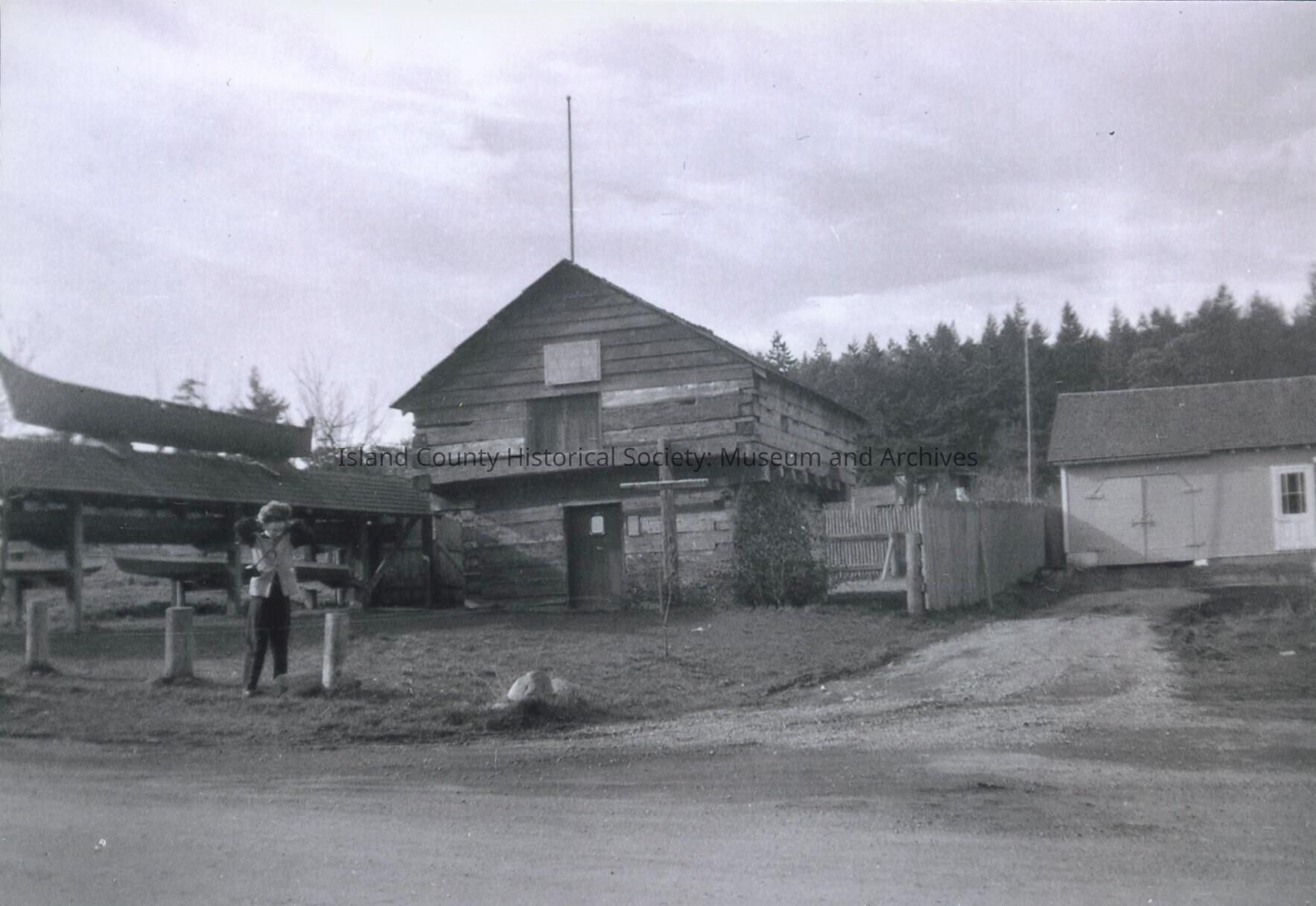 A photo of the Alexander blockhouse and the canoe shed, taken sometime in the 1940s or 1950s.