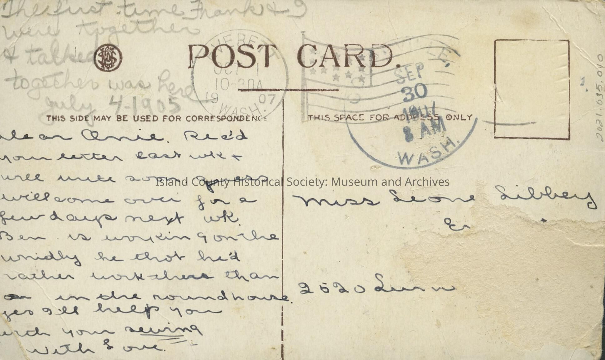 A post card with a photo of Stills Park on it, to Leona Libbey