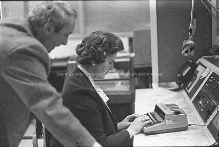 Island County Sheriff Dick Medina looks on as woman at desk types on a small machine with an attached telephone handset. A microphone and a panel of screens are in front of her.