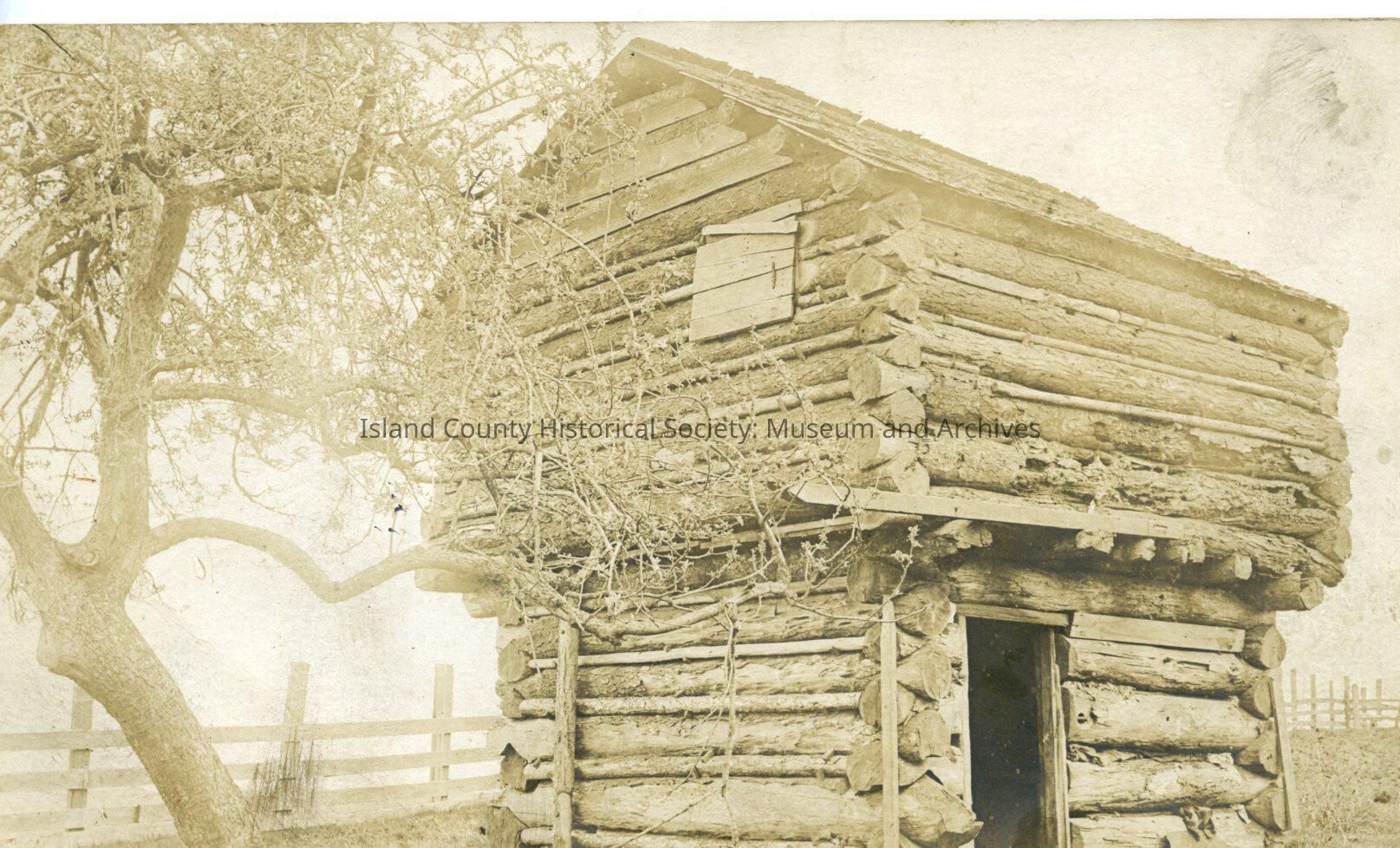 Front and side of Ebey blockhouse. Window on the top has a board over it. Door on the right side. A tree is on the left side and a split rail fence behind the blockhouse.