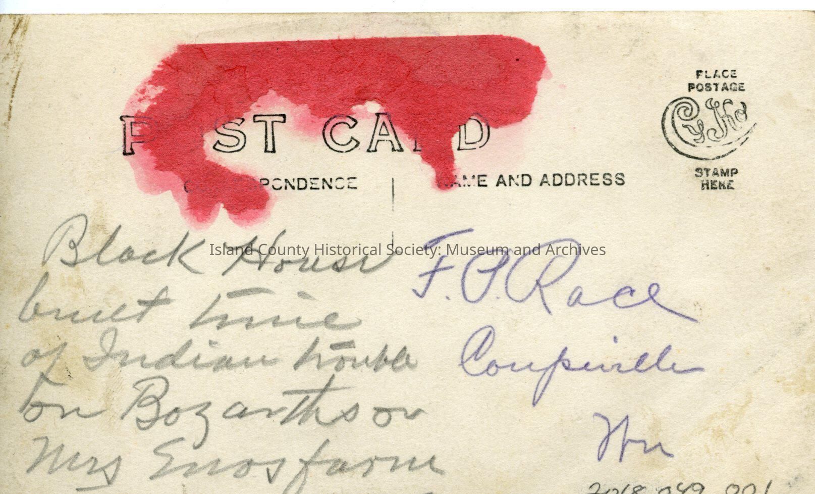 On the back: Blockhouse built time of Indian trouble on Bozarths or Mrs. Enos farm.