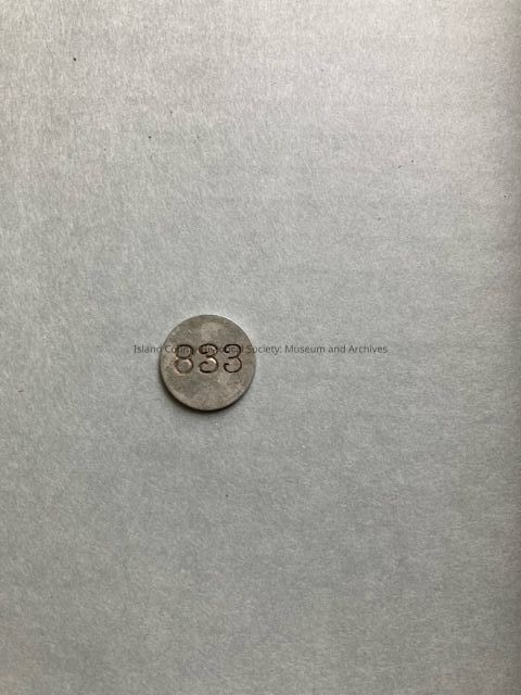 In original notebook recorded as: "Trade coin 833 - 10 cents" Used by Ruby Hancock.