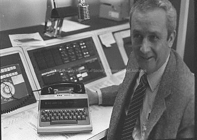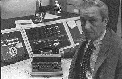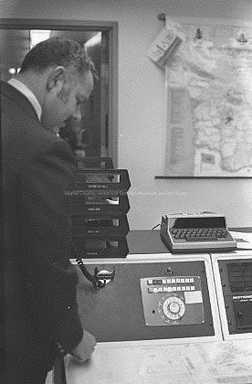 Sheriff Dick Medina sits in front of a desk with a small machine that contains a keyboard and a telephone handset. Behind it are panels containing dials, buttons and a hanging microphone.