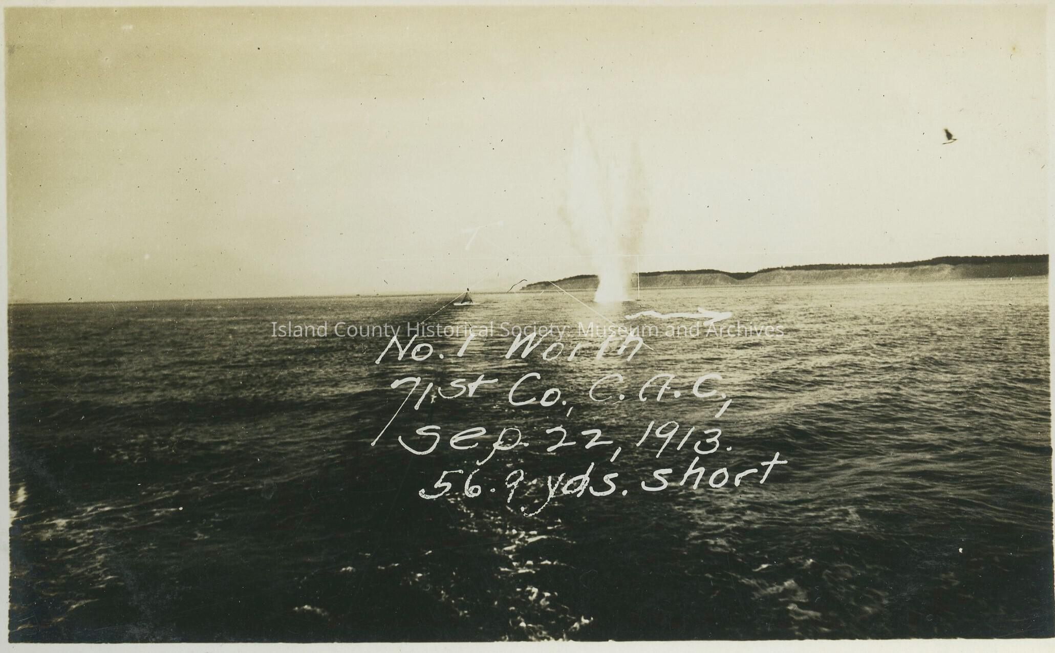 Postcard from Fort Casey. Photo is of the water with "No. 1 Worth 71st Co. C.A.C. Sep 22, 1913 56.9 yds short" (series of photos .002-.008)Collection