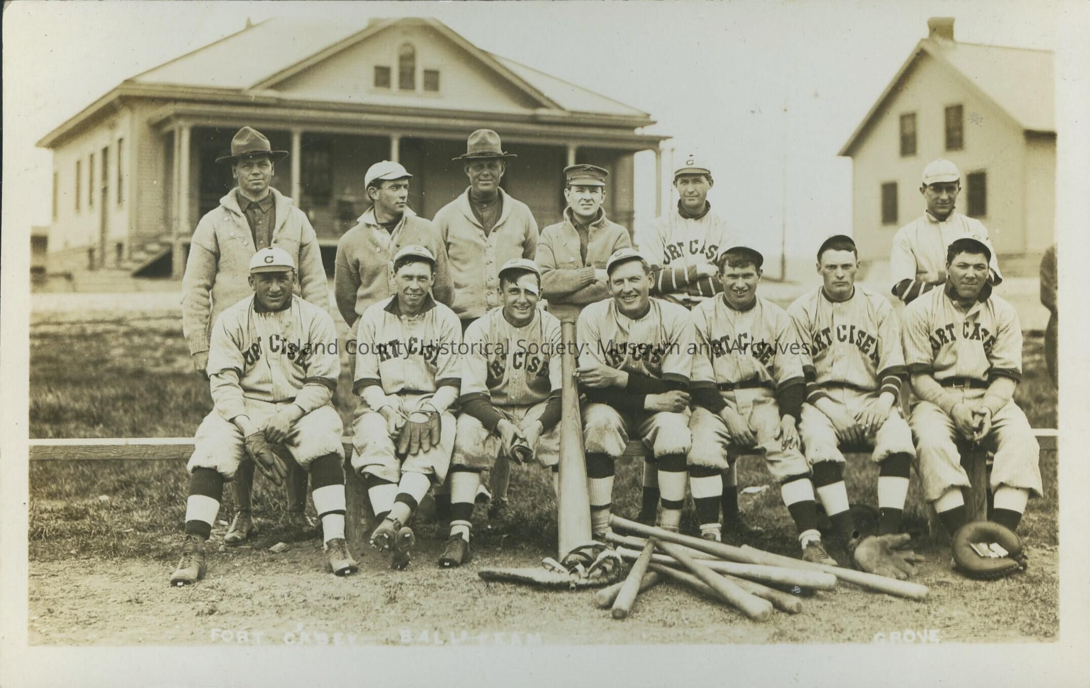 Postcard from Fort Casey. Photo is of thirteen men, most wearing baseball uniforms, with a pile of baseball bats at their feet.