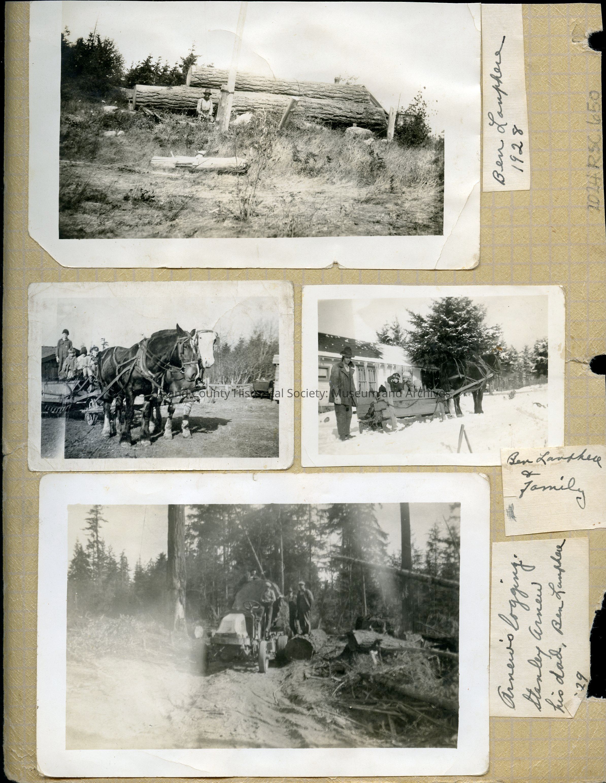 On the sheet which contains four photos, the writing next to the top photo reads "Ben Lanphere, 1928". The writing next to the photos below read, respectively, "Ben Lanphere & Family" and "Arnew's Logging. Stanley Arnew, his dad, Ben Lanphere 1929".Photograph Details