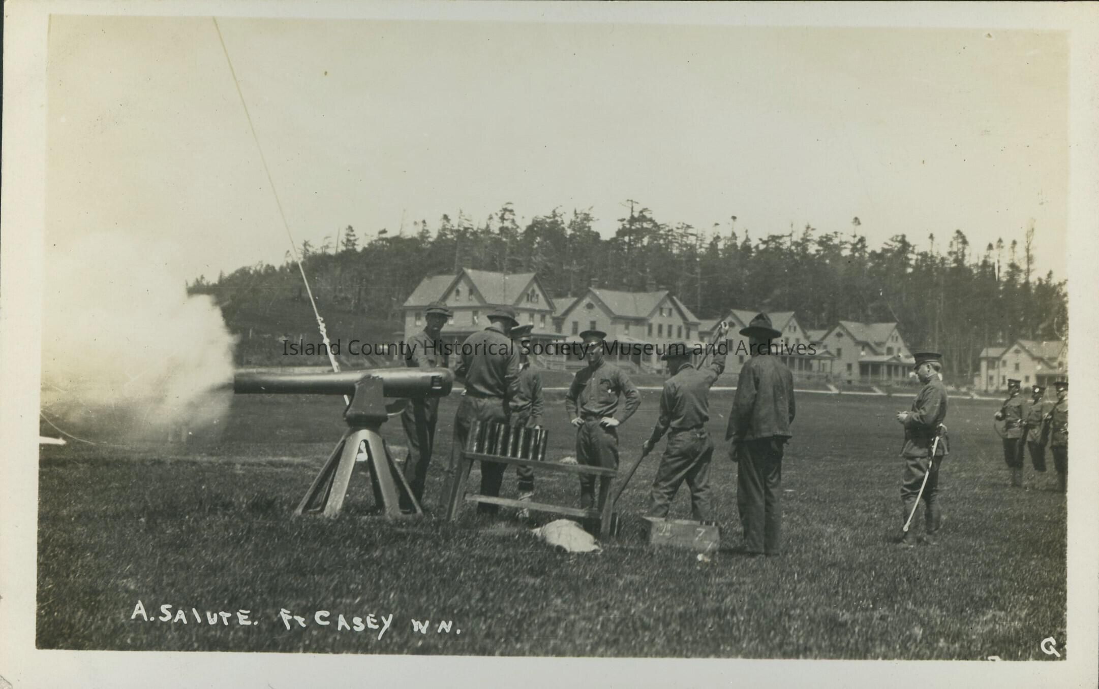 Postcard from Fort Casey. Photo is of men standing in uniform with a small cannon. Photo reads "A salute ft casey wn"Collection