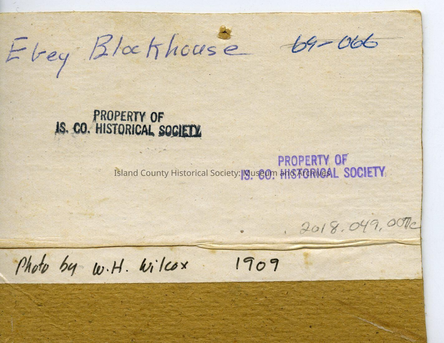 Front and side of Ebey blockhouse with the door to the left. There is a window on the top on the right side. There is a fence behind it. On the back: Ebey Blockhouse. Photo by W.H. Wilcox. 1909 The photo is attached to a piece of cardboard.