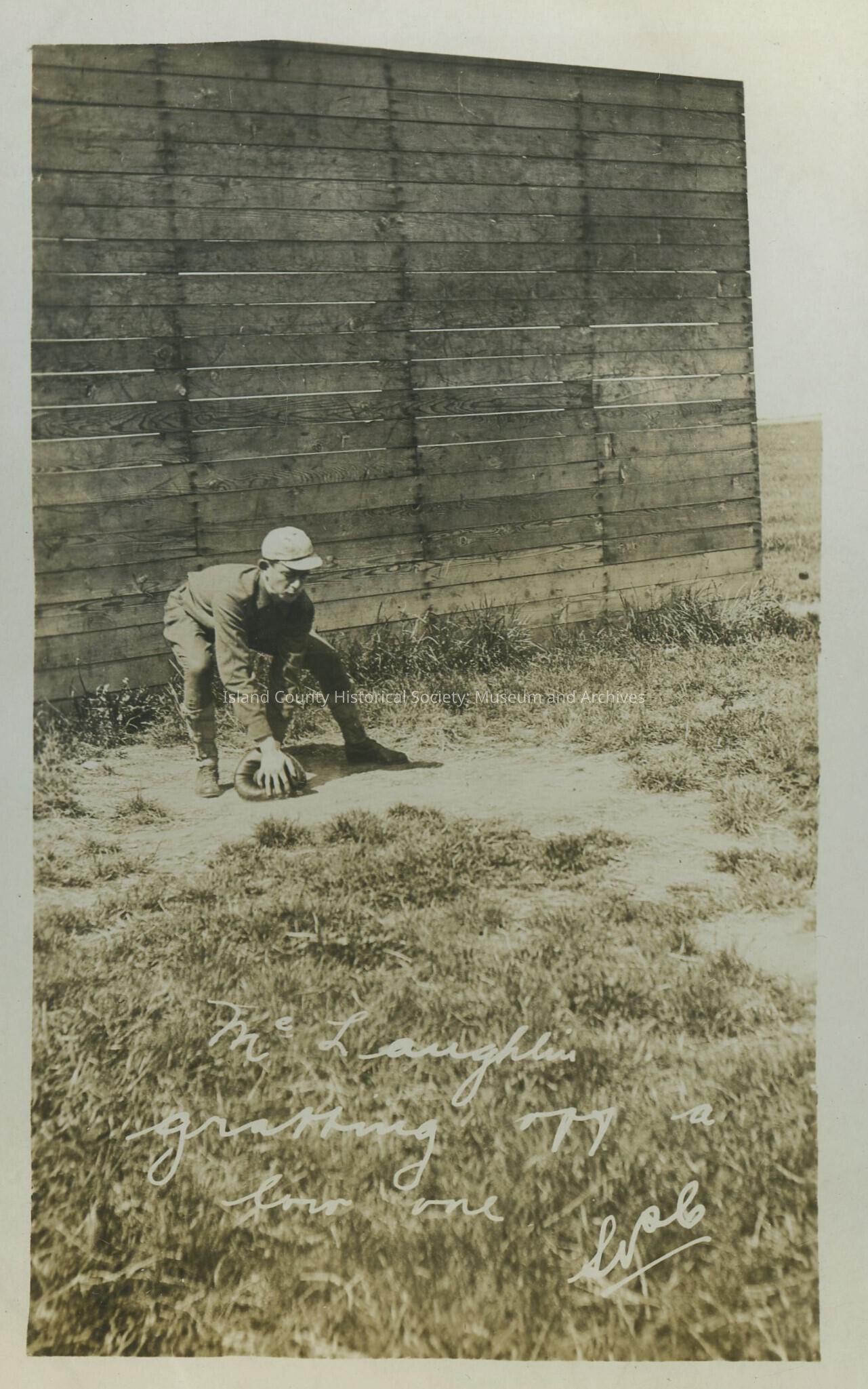 Postcard from Fort Casey. Photo is of a man catching a baseball. " McLaughlin ? off a low one"Collection