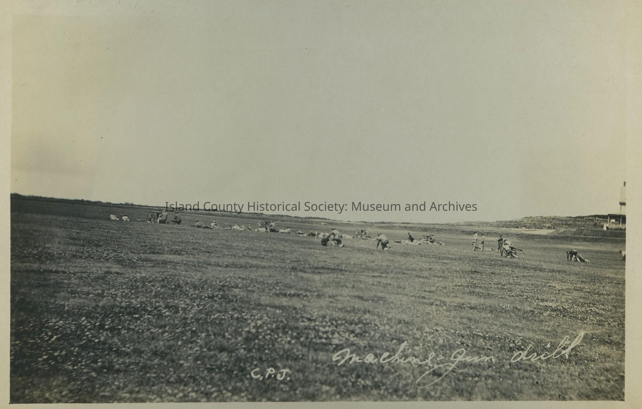 Postcard from Fort Casey. Photo is of men performing a machine gun drill.Collection