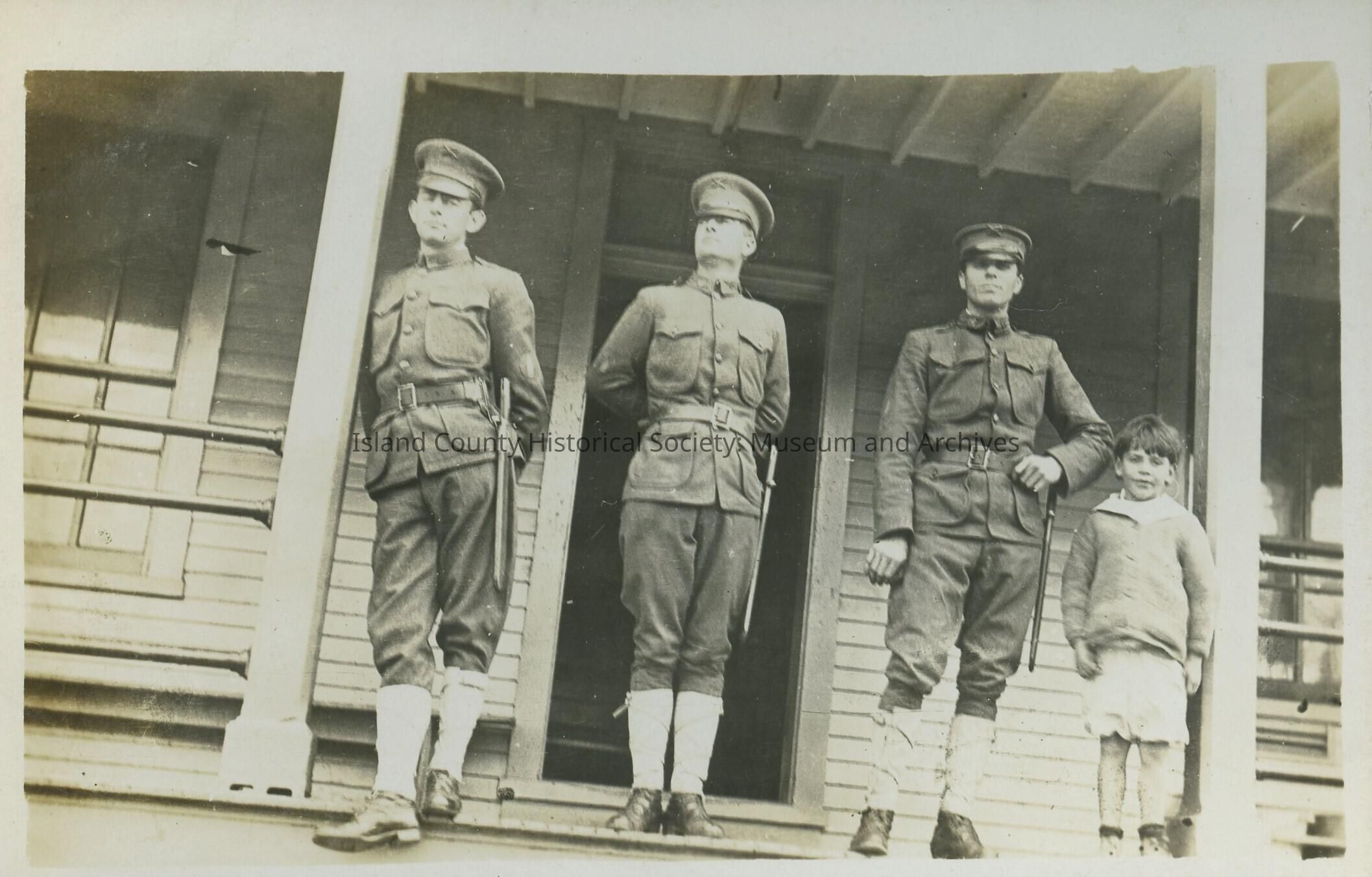 Postcard from Fort Casey. Photo is of three men standing in uniform on a porch, along with a young boy.Collection