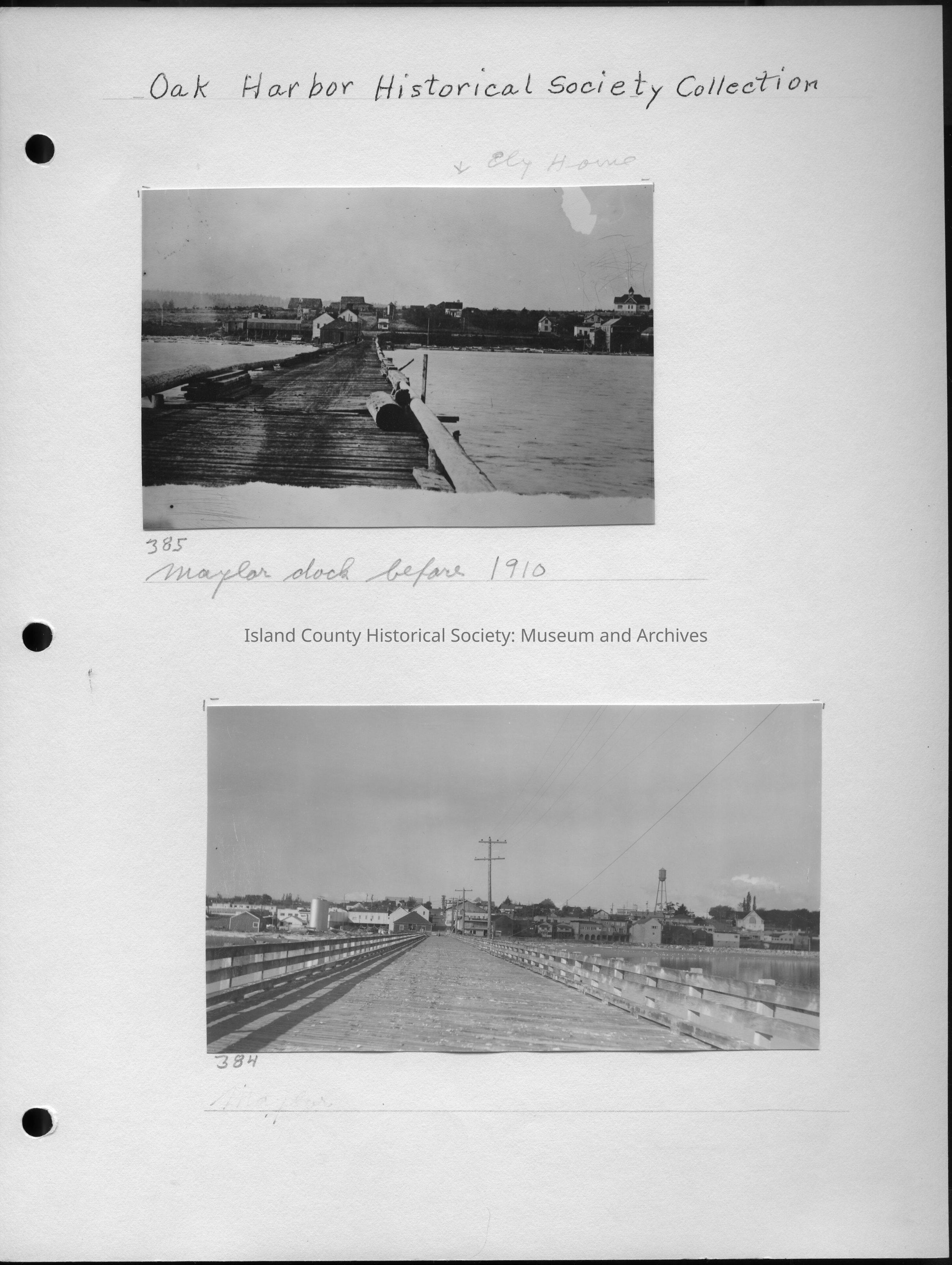 Top Photo - 4.5"W x 3"H - Photo of the Maylor pier and dock looking toward the town of Oak Harbor before 1910. There is a church on the right up on the hill.