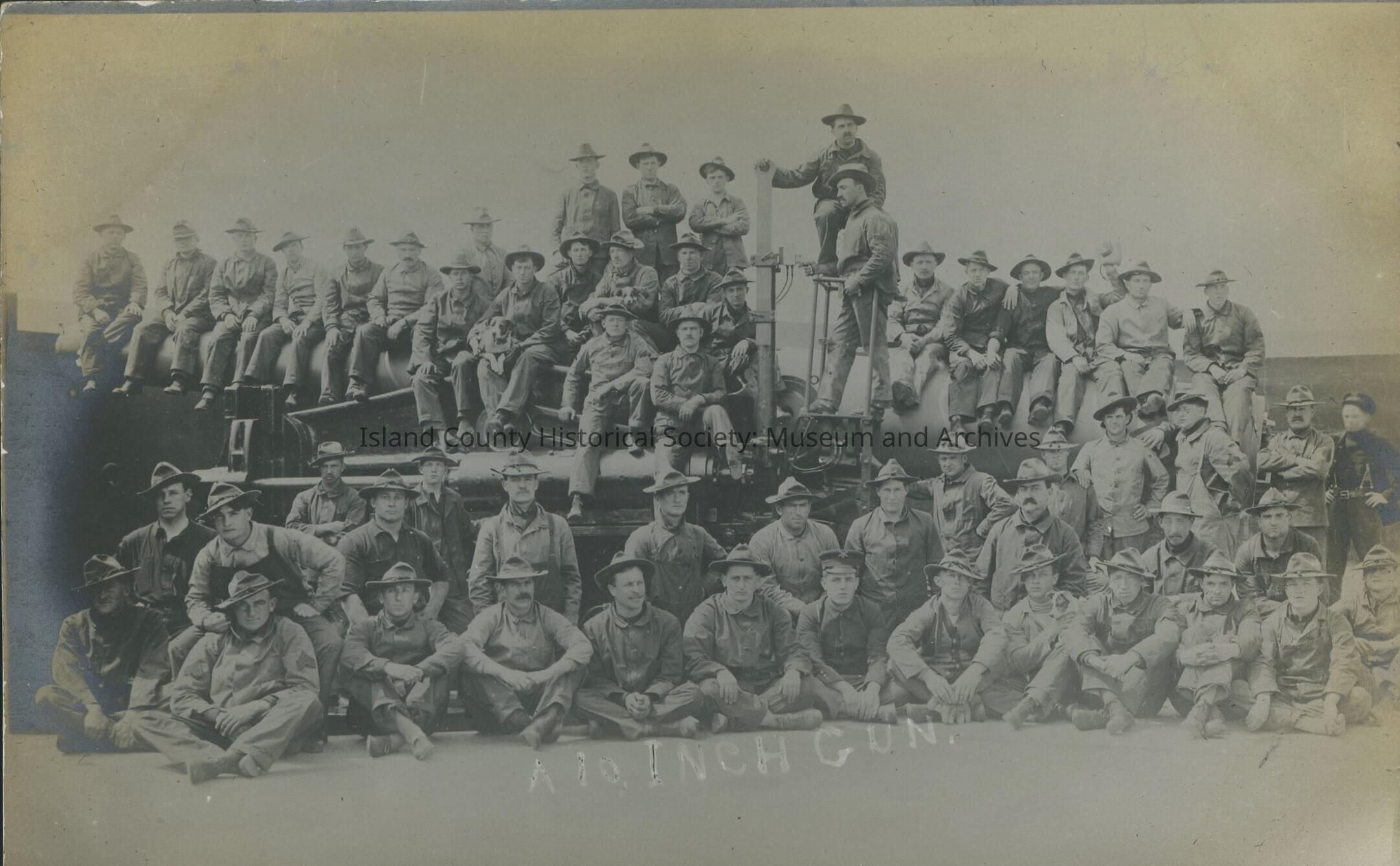 Postcard from Fort Casey. Photo is of men sitting and standing in their uniforms around a 10 inch gun.Collection