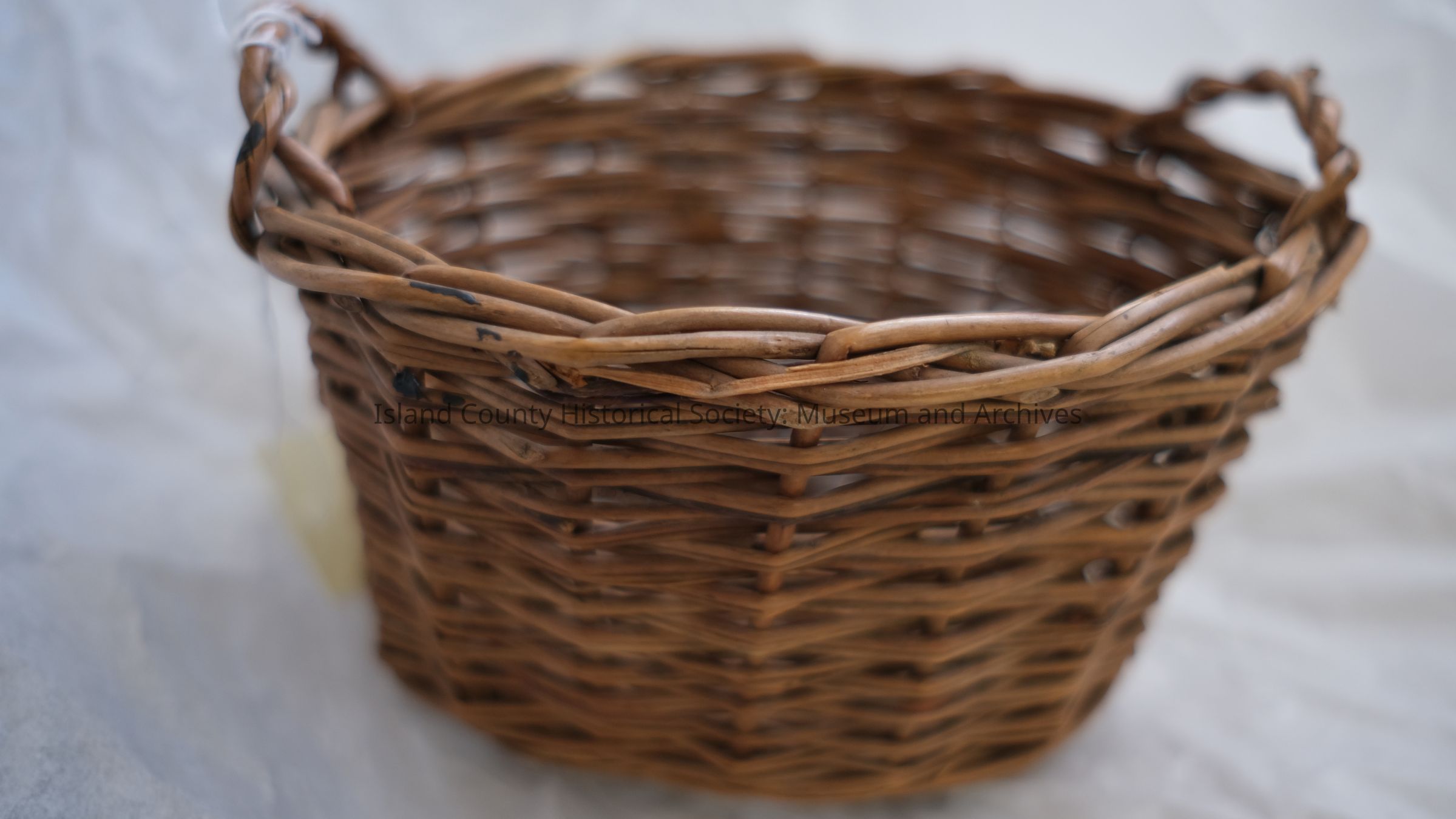 Oval baby basket of tan wicker, twisted wicker handles on each end.Collection