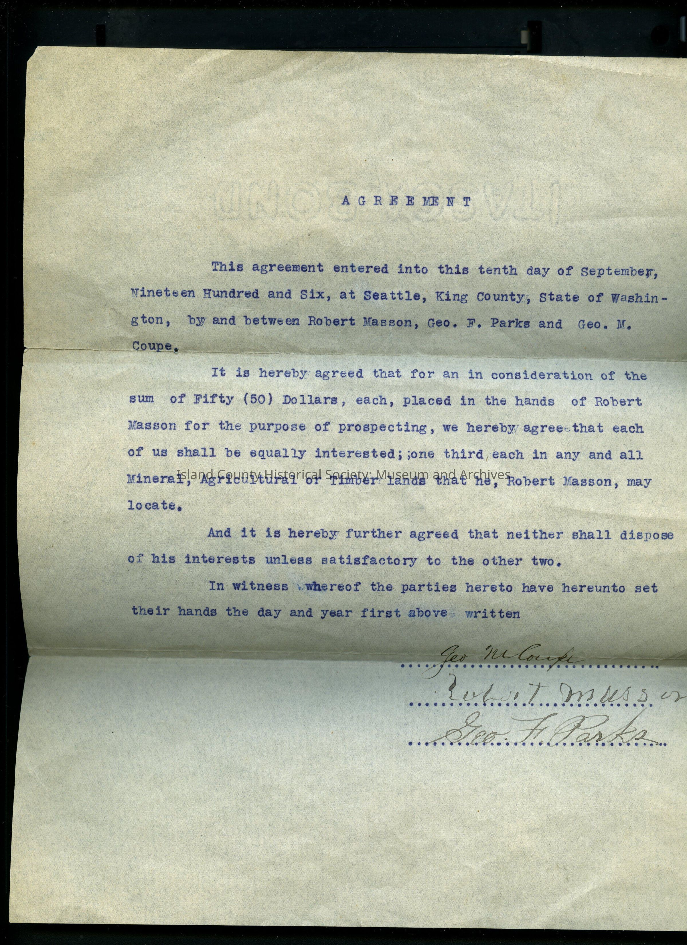 George Coupe Agreement by and between Robert Masson , George Parks, and George Coupe.Relationships