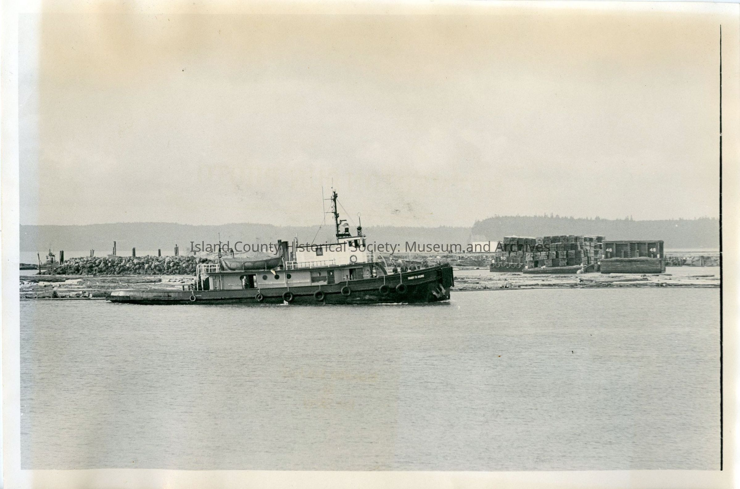 Photograph of the Mary D. Hume delivering a log raft to Everett in December 1975.