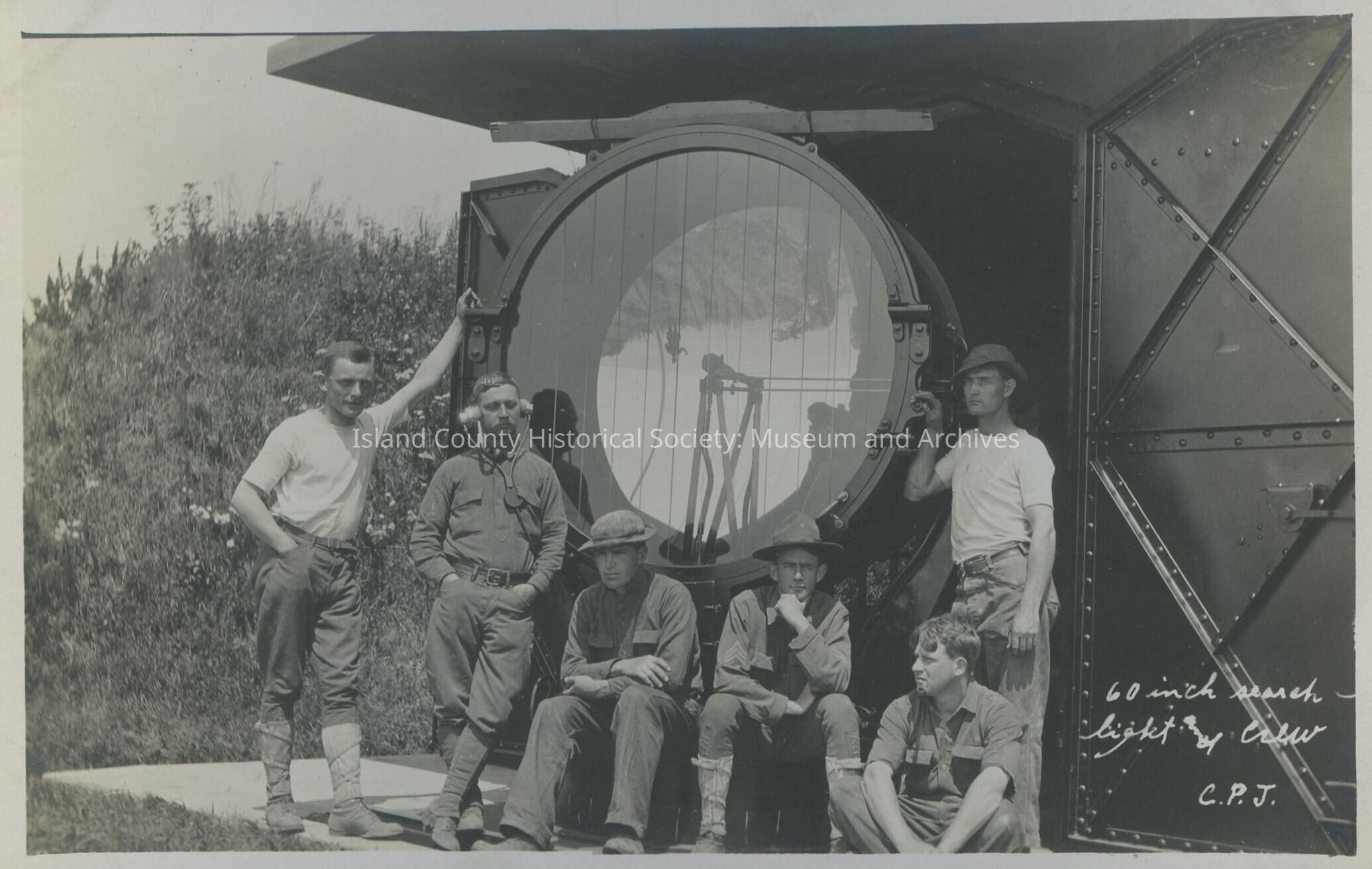 Postcard from Fort Casey. Photo is of men standing in front of a 60 inch search light wearing uniforms. One man is wearing a headset.Collection