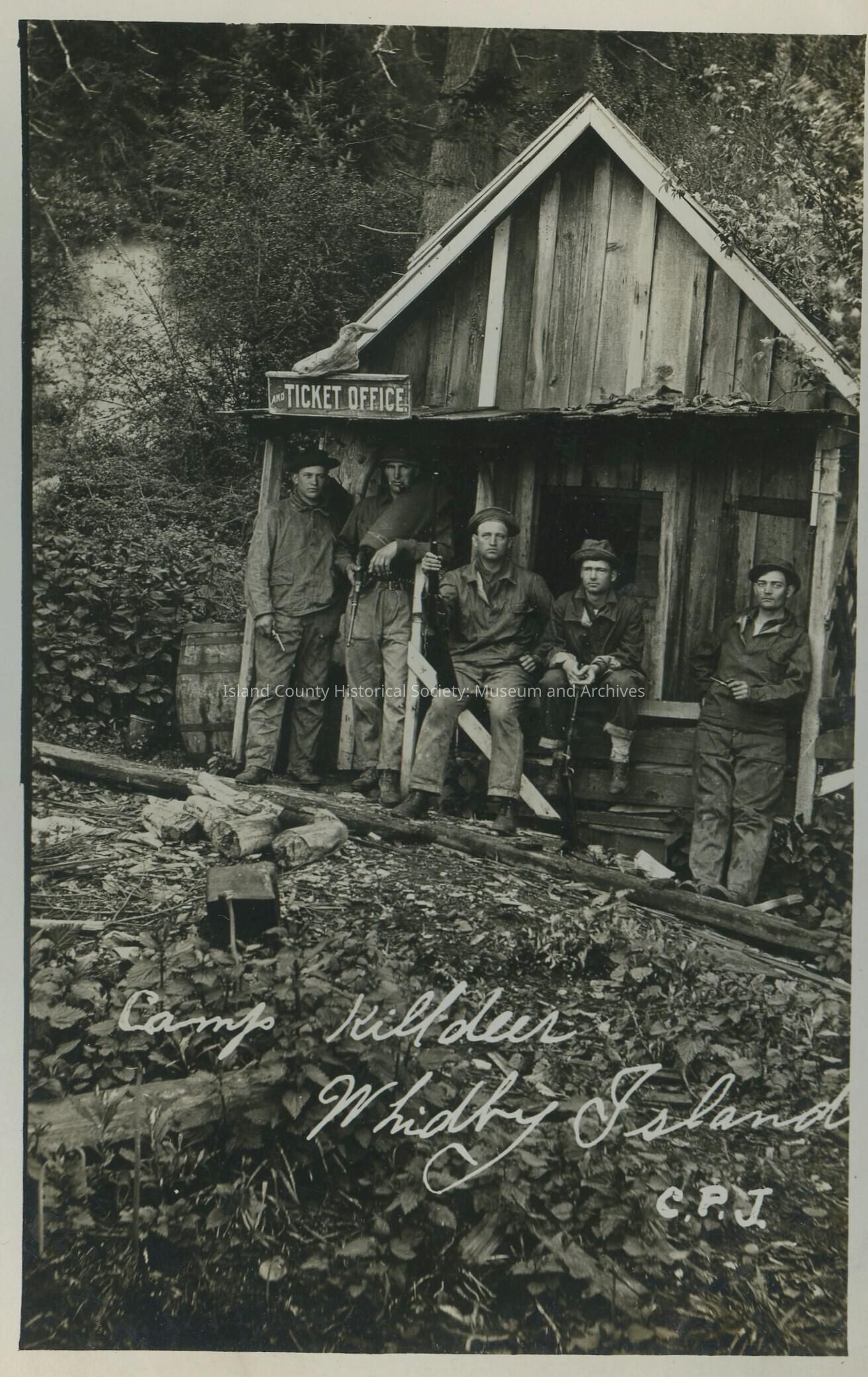 Postcard from Fort Casey. Photo is of men standing in front of a small building with a sign on it that reads Ticket Office. Photo reads " Camp Killdeer Whidby Island "Collection