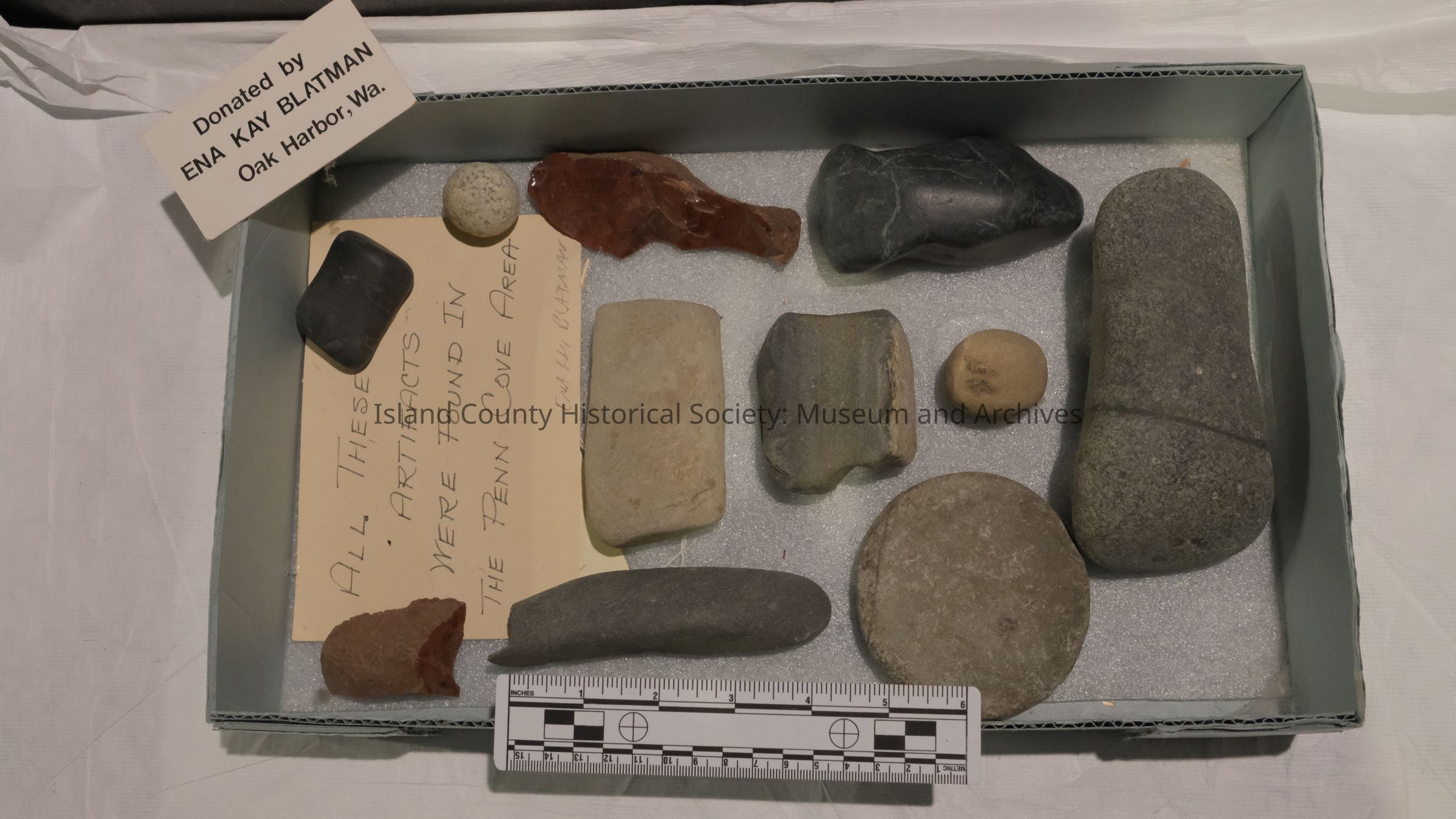 Box of assorted artifacts found and donated by Ena Kay Blatman in the Penn Cove area