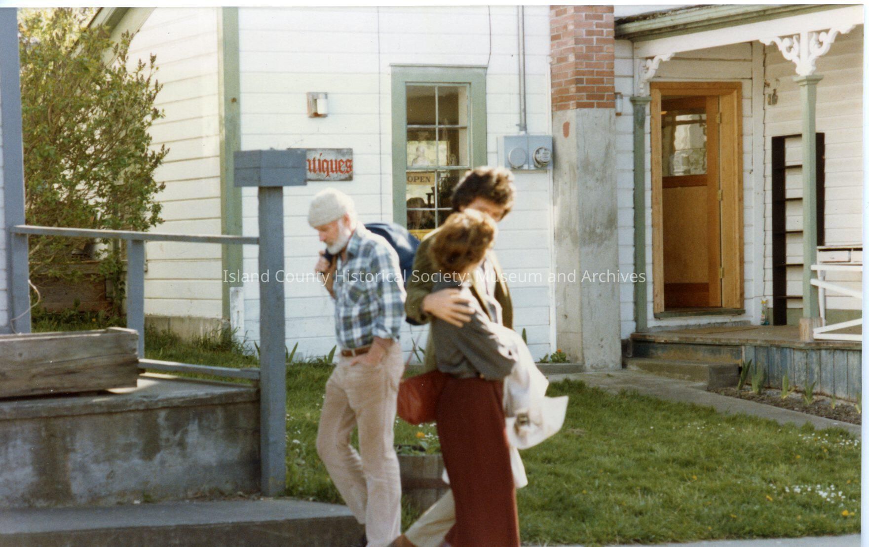 Color photograph of people walking along Front Street in front of Robertson House. Man has arm around woman's shoulder. Another man walks behind in opposite direction. Filming of Cry for the Stranger in Coupeville, 1982. Note on back: Jack McPherson - extra, Cindy Pickett, Patrick Duffy.Made/Created