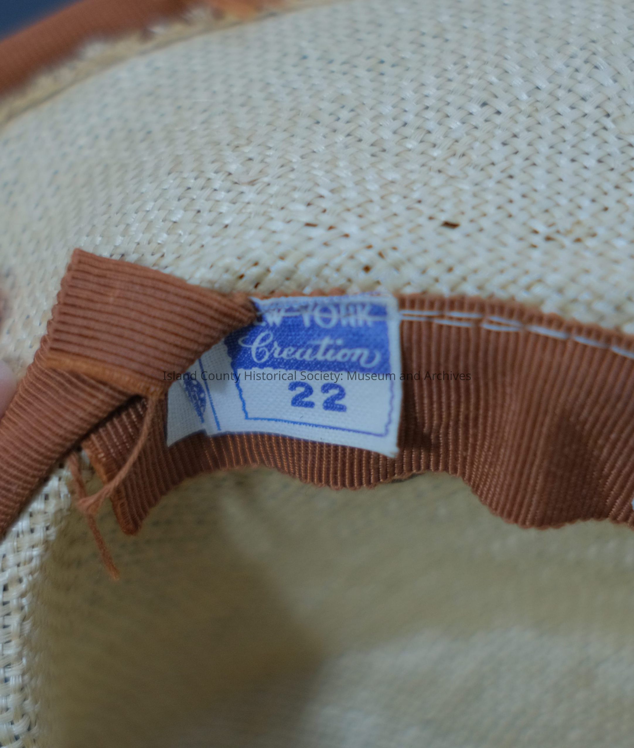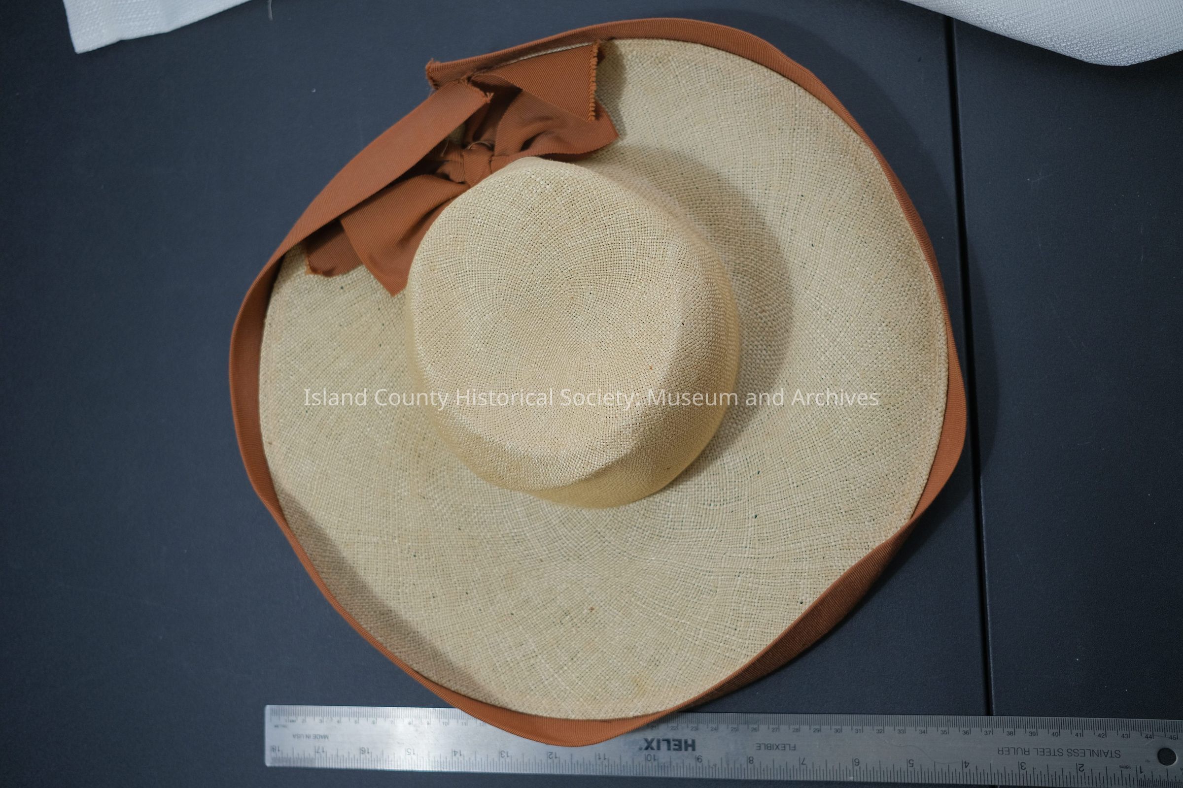 tan straw hat w/ rust colored ribbon around wide brim; bow at backCollection
