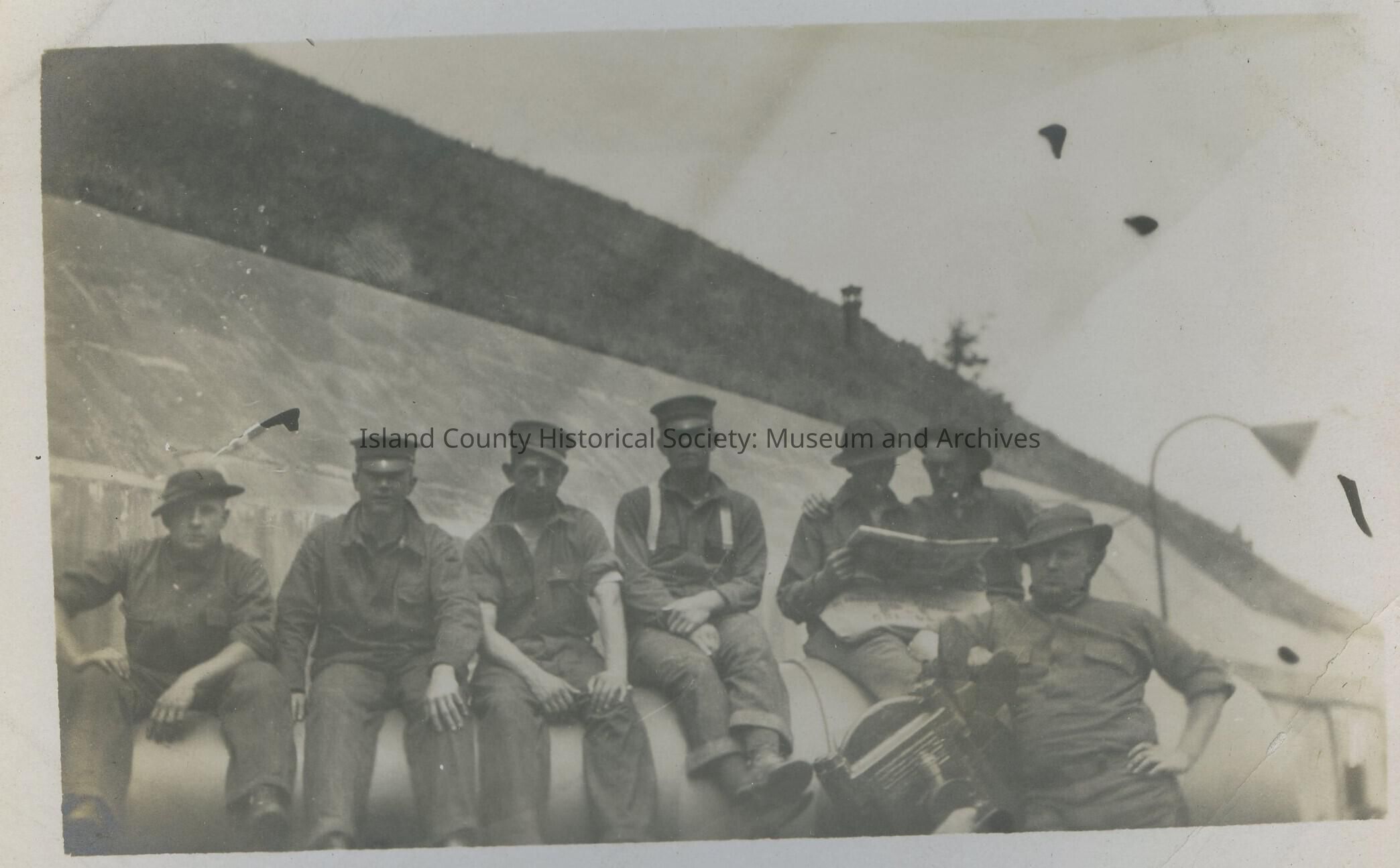 Postcard from Fort Casey. Photo is men in uniforms. Two men in the photo are looking at a newspaperCollection