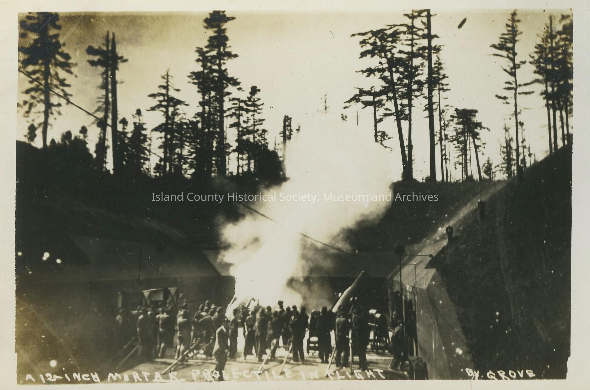 Postcard from Fort Casey. Photo is of " a 12 inch mortar projectile in flight " men can bee seen watching the blast and there are trees in the background.Collection