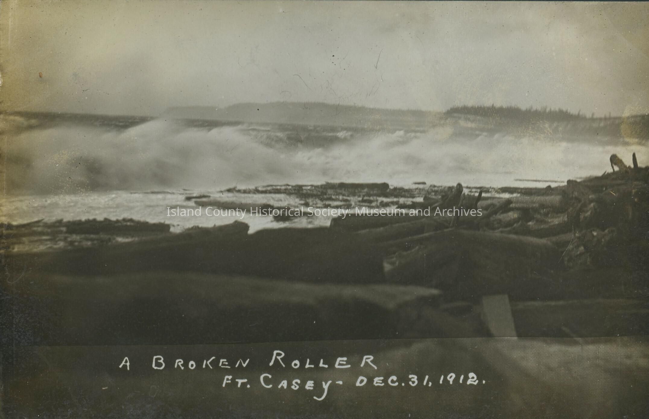 Postcard from Fort Casey. Photo is of driftwood and logs on the beach. Photo reads " A broken roller ft. casey Dec 31 1912 "Collection