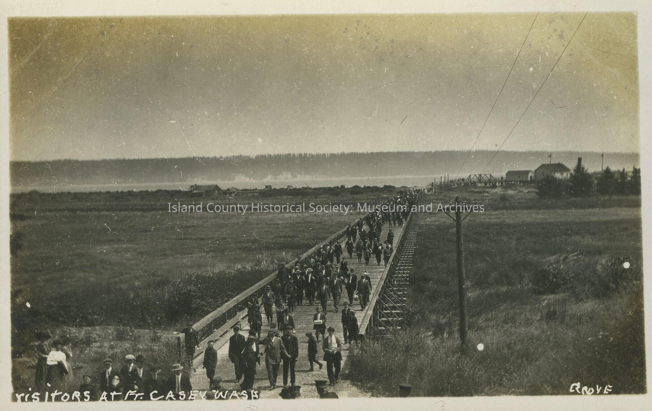 Postcard from Fort Casey. Photo is of " Visitors at Ft. Casey Wash" and shows a crowd of people walking down a boardwalk.Collection