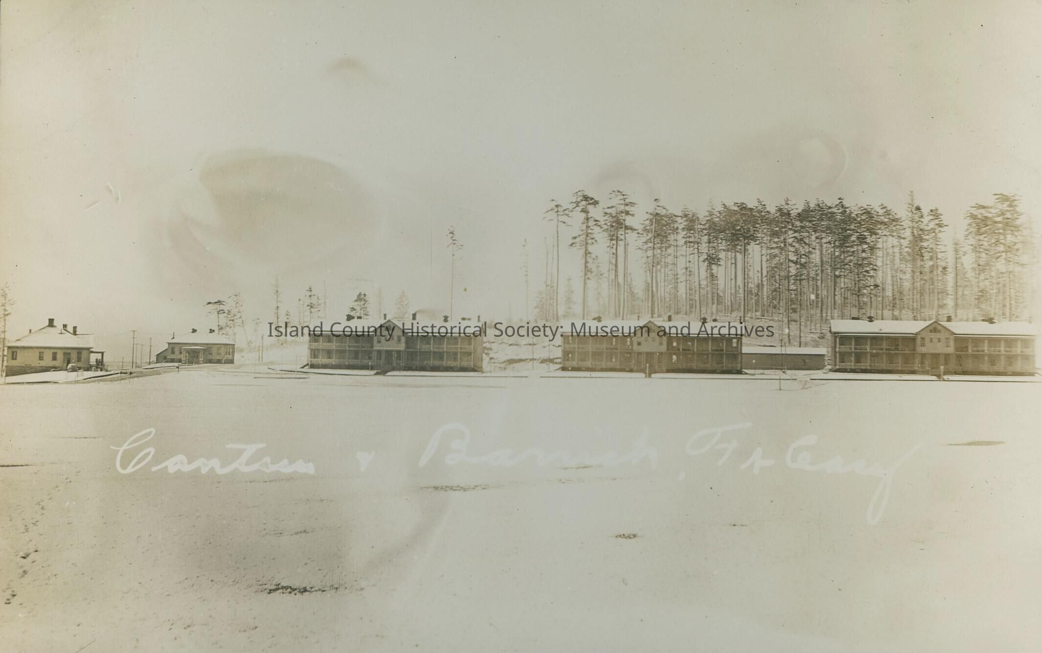 Postcard from Fort Casey. Photo is of the barracks covered in snow.Collection
