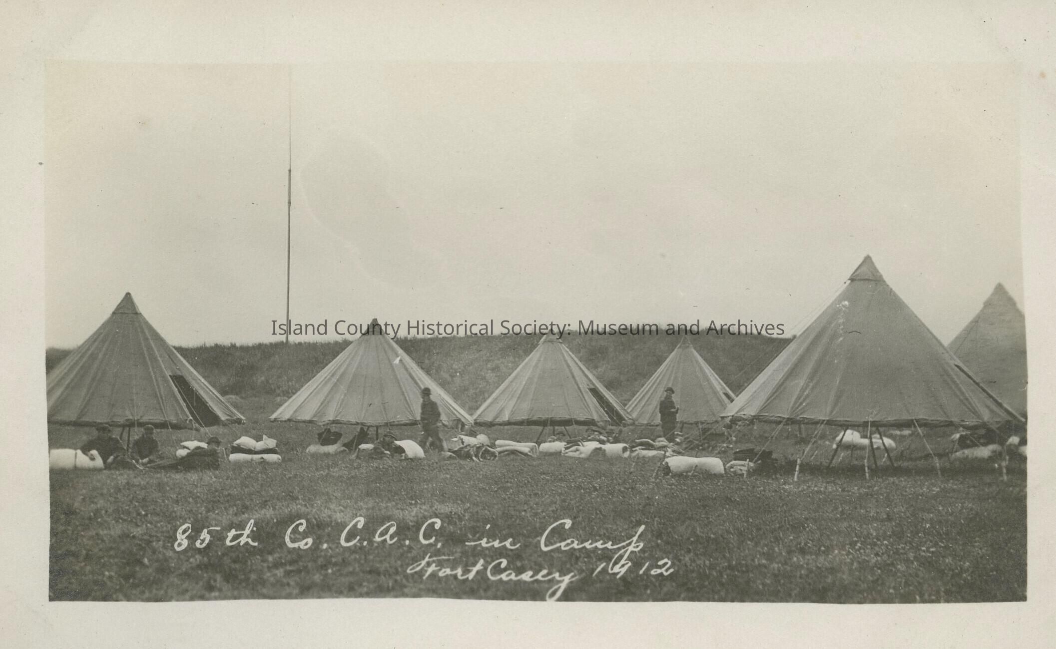 Postcard from Fort Casey. Photo is of tents set up in a field. It reads " 85th Co. C.A.C. in Camp 1912"Collection