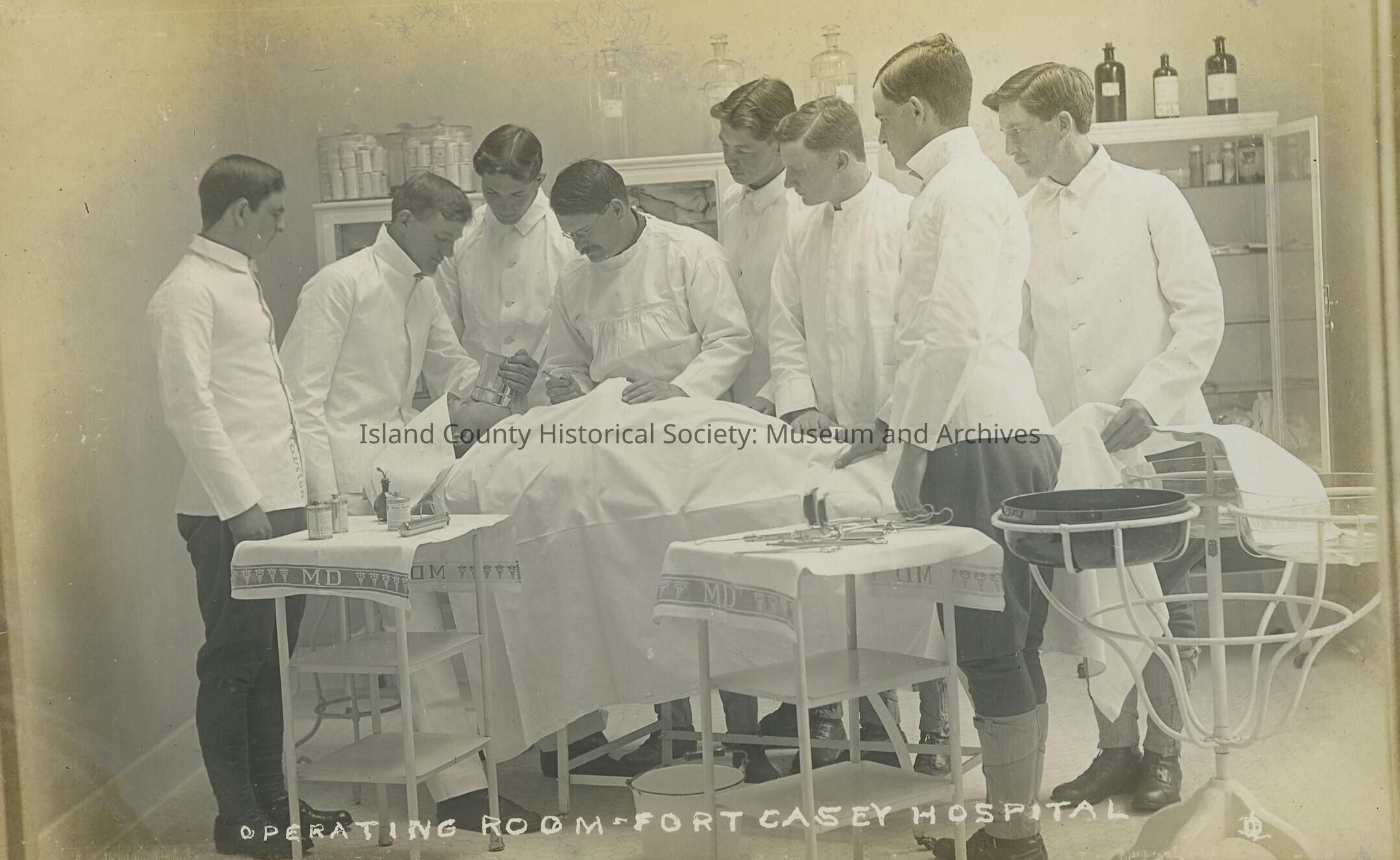 Postcard from Fort Casey. Photo is of men wearing white coats standing around a man laying on a table. It reads " Operating room - Fort Casey Hospital "Collection