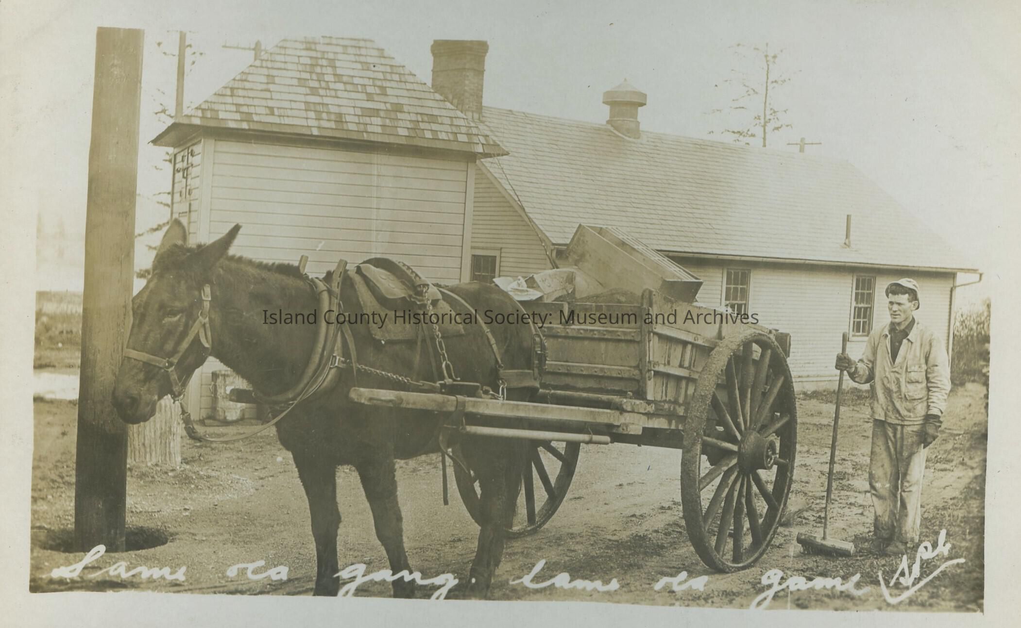 Postcard from Fort Casey. Photo is of a man standing next to a horse pulling a cart. It reads " Same co gang "Collection