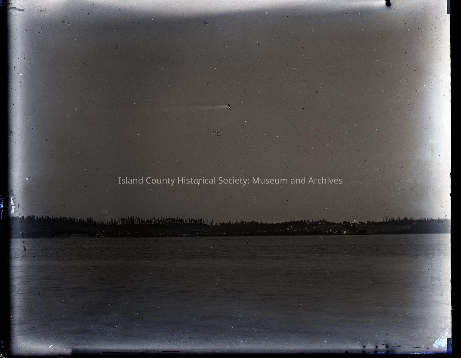 negative is a picture of lawnscape and water. The water is calm. It appears to be a clear day, however, it is difficult to tell because the negative is not very clear and it is dark. Along the outside of the photo there is fading and corrosion. There appears to be buildings along the bank of the land. 20 sec exposure.Collection
