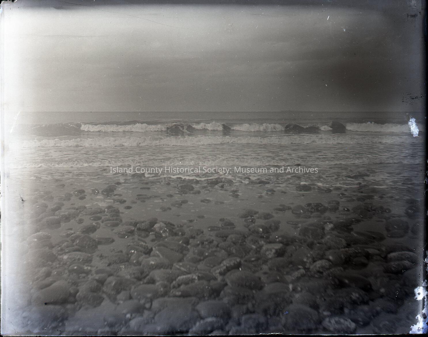 Image looks out to waves from beach with scattered rocks and other flora. 60 second exposure.Collection