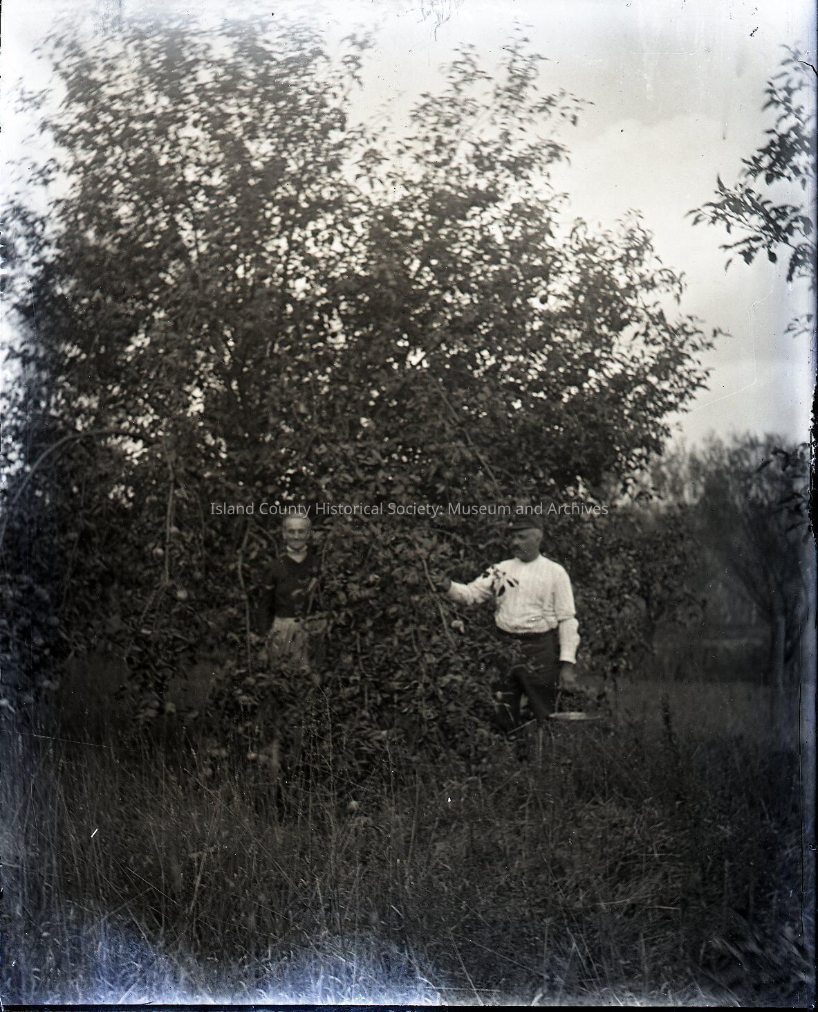 Image of two people. One person partially obscured by an apple (?) tree and the second person wearing a long-sleeved white shirt, cap, and mustache.Collection
