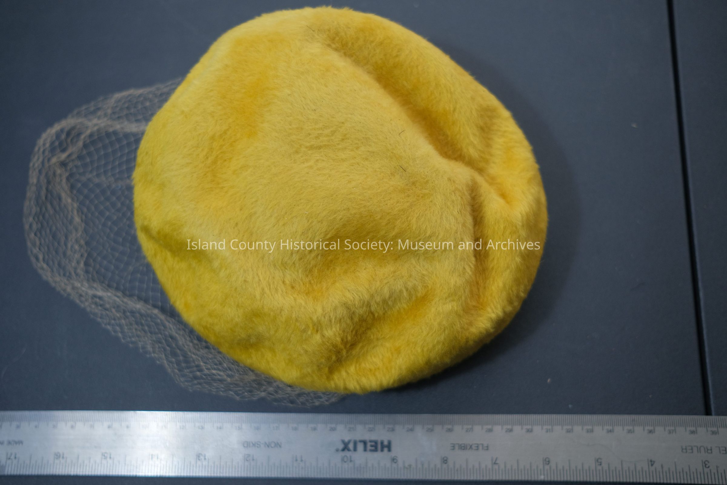 Golden fur felt pillbox hat w/ net veil and rhinestone detailCollection