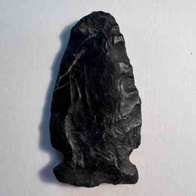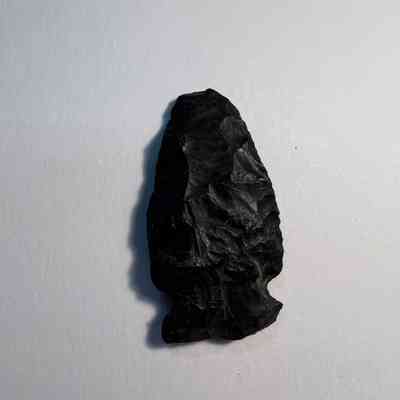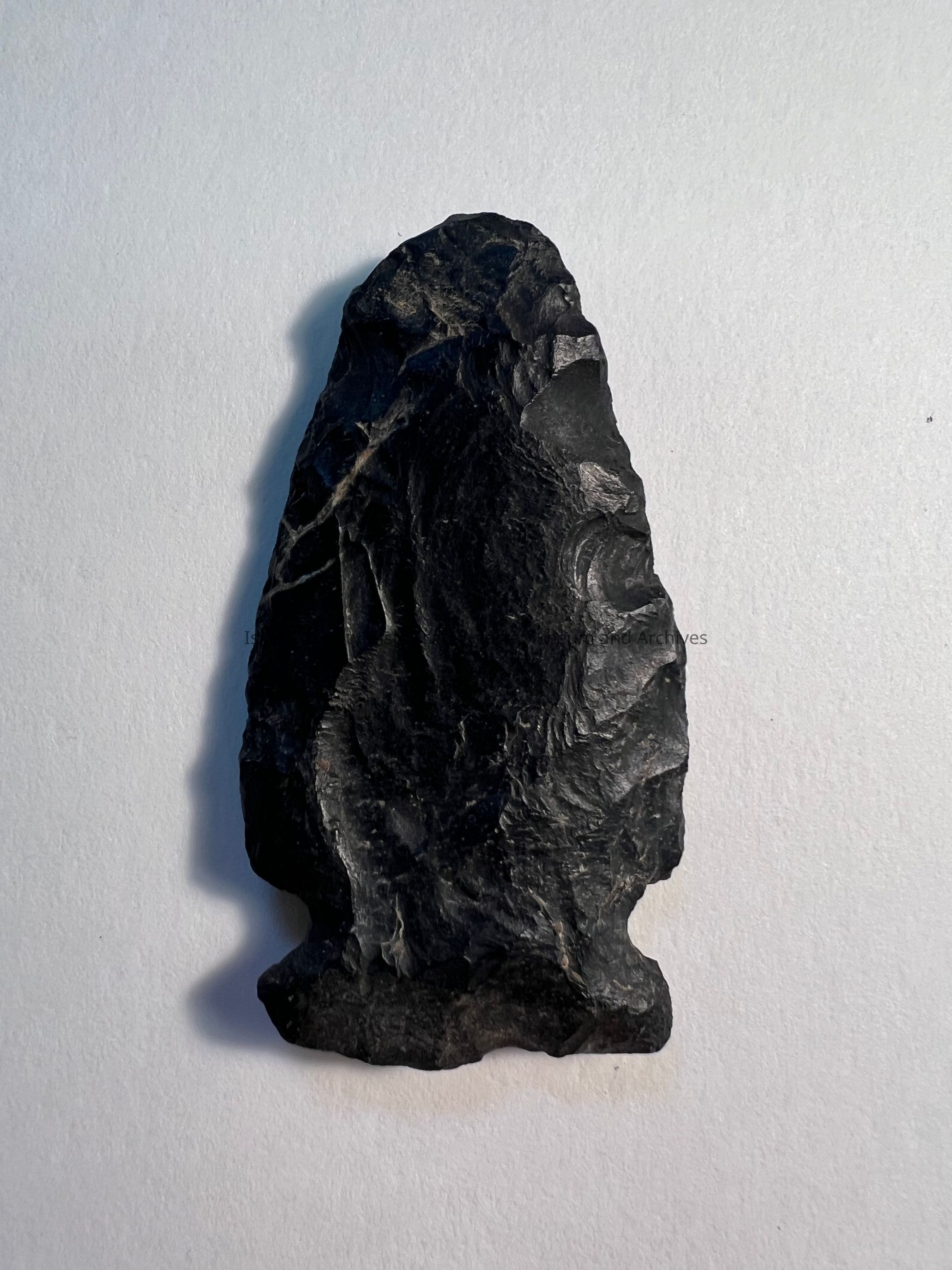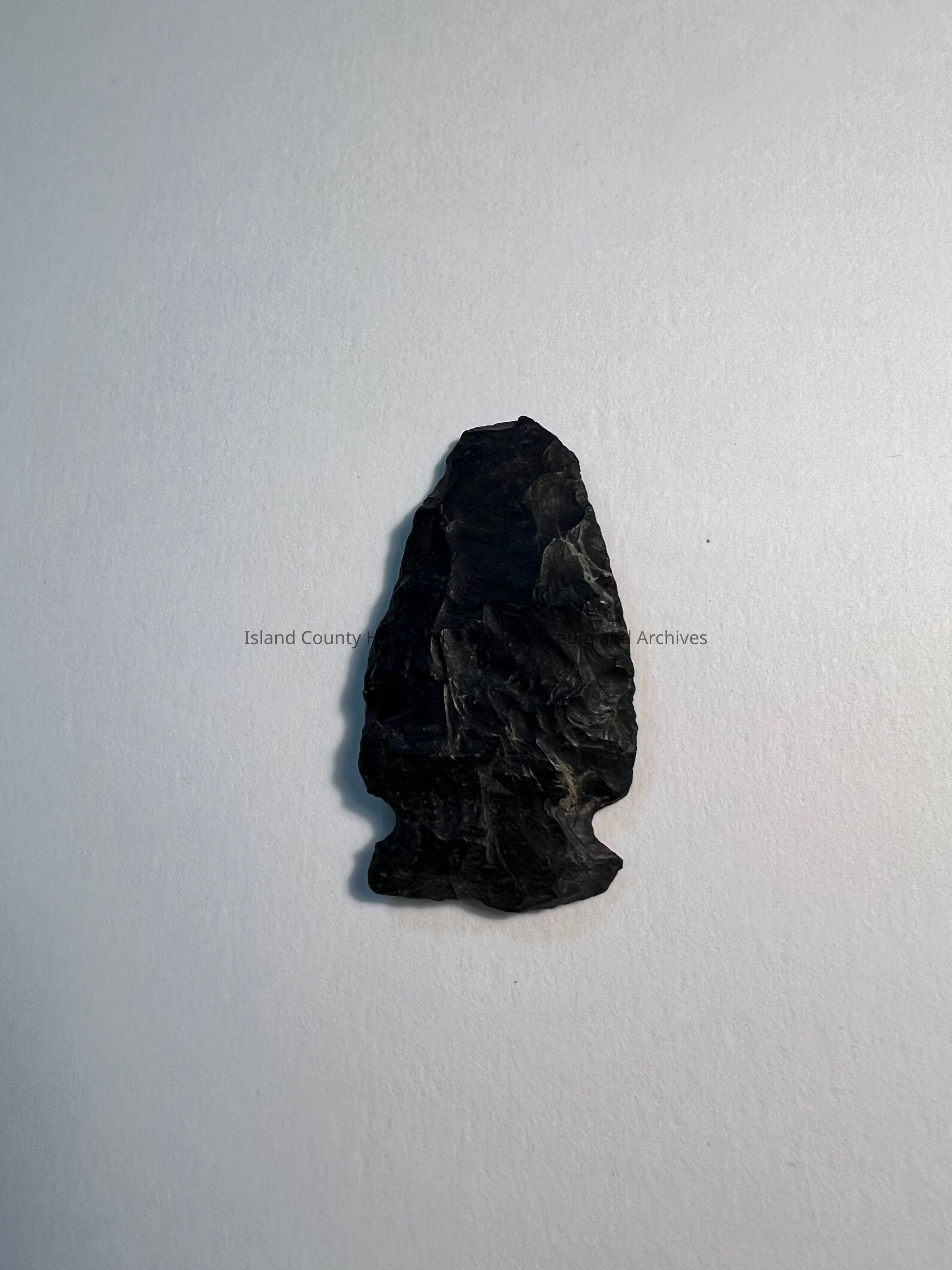 Dacite (finer grain basalt) side notched slightly flared base. Reworked. Dacite is found in Puget Sound, Canada, and Whidbey Island. Possibly mid-Holocene, 3,000-6,000 years old. Without context, it is difficult to date.Collection
