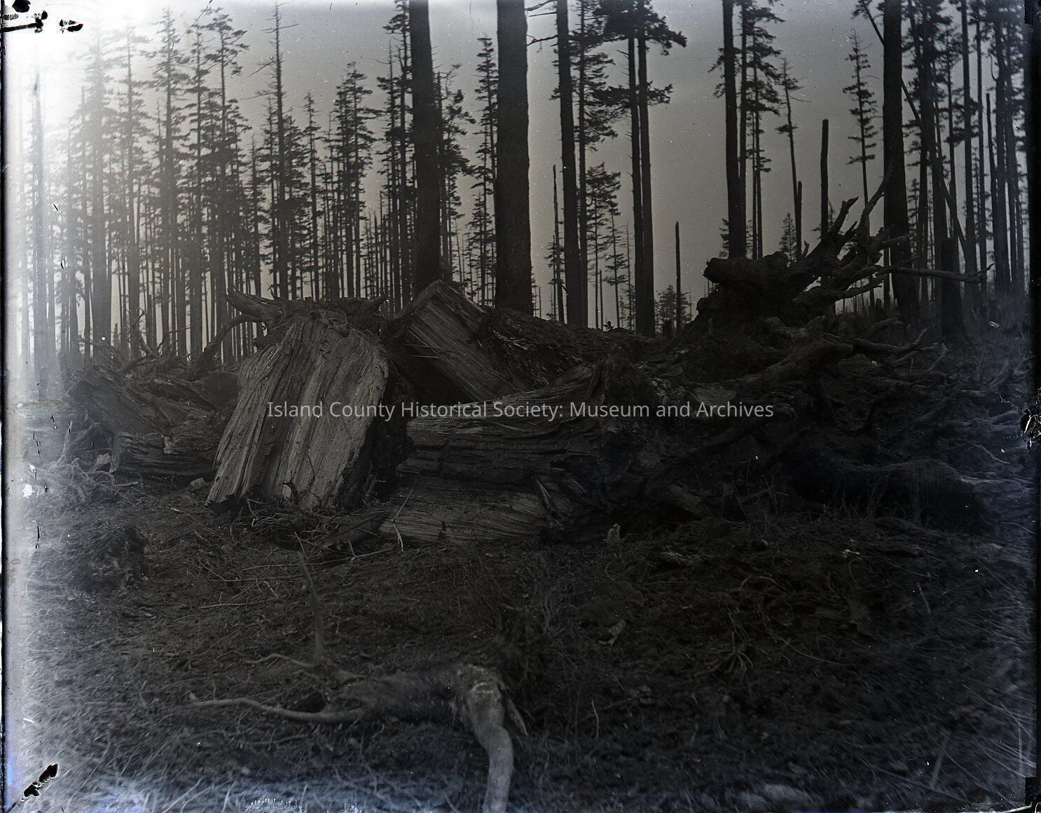 Clear cut area in foreground with an overturned tree in center of image, root system facing the the right of the image. Trees visible in background. 8 second exposure. Slightly better version of 009.Collection