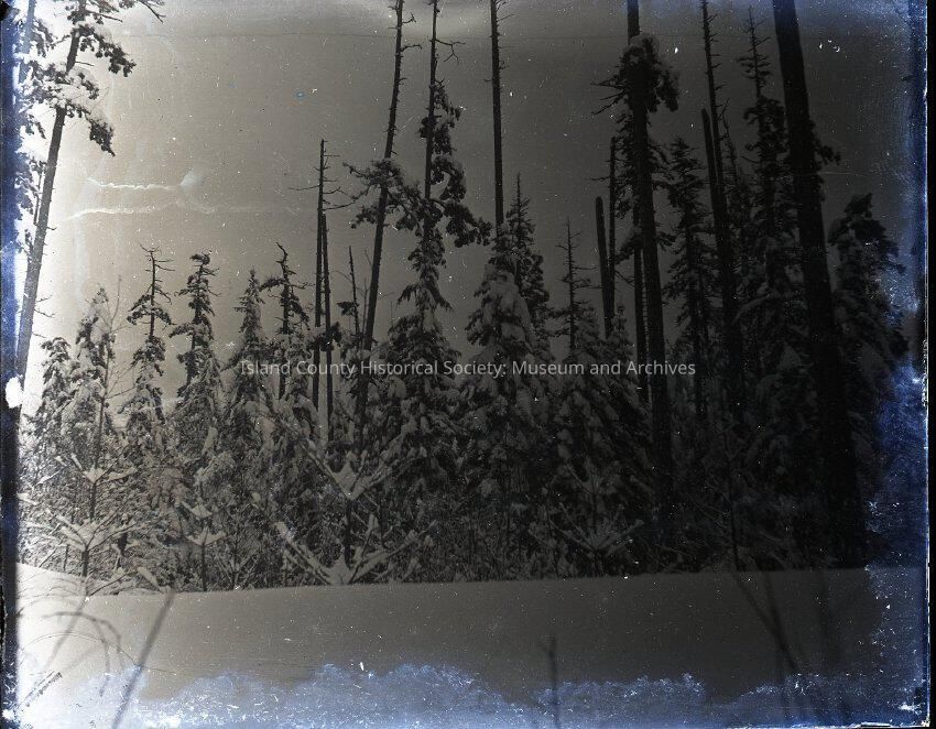 Snow covered trees (some trees do not have many branches). Image is "foggy" at the bottom. Damaged around the edges of the image.Collection