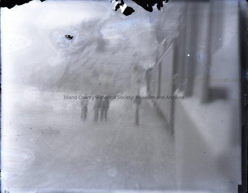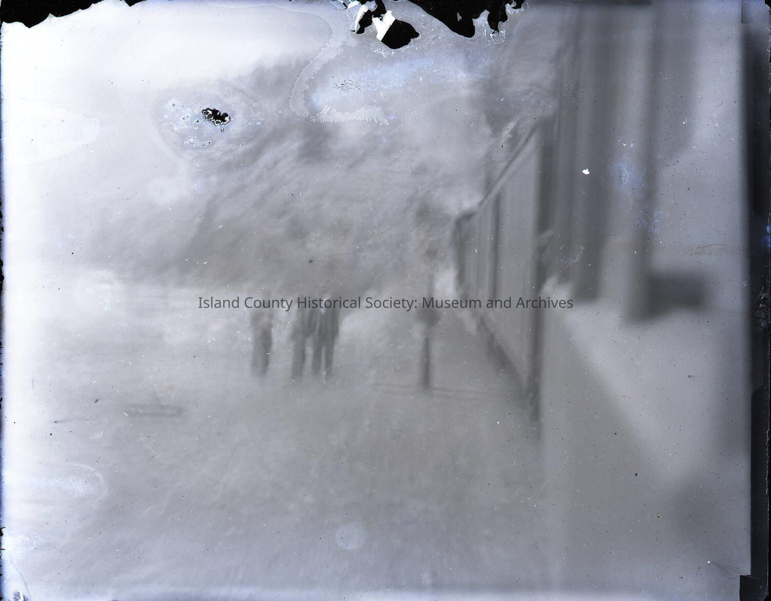 Extremely blurry image of three people standing next to a train (?).Collection