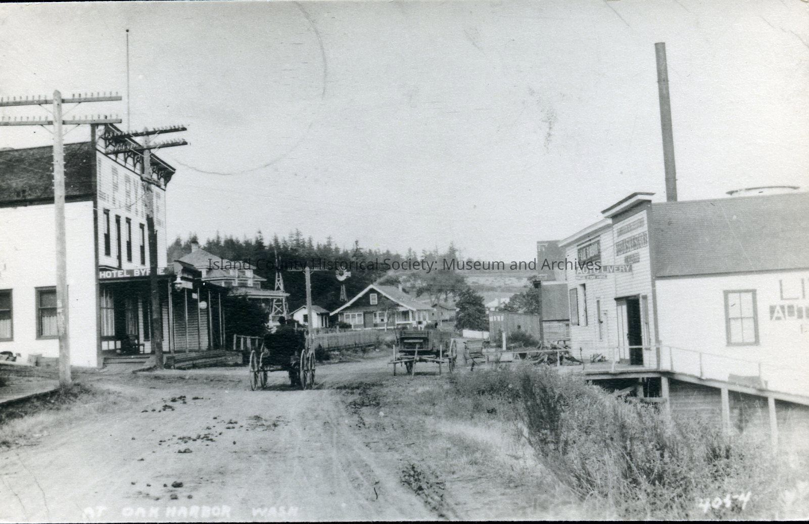 Postcard depicting the east end of Barrington Avenue in Oak Harbor, c. 1900-1920. Note the L.P. Byrne Hotel on the left.