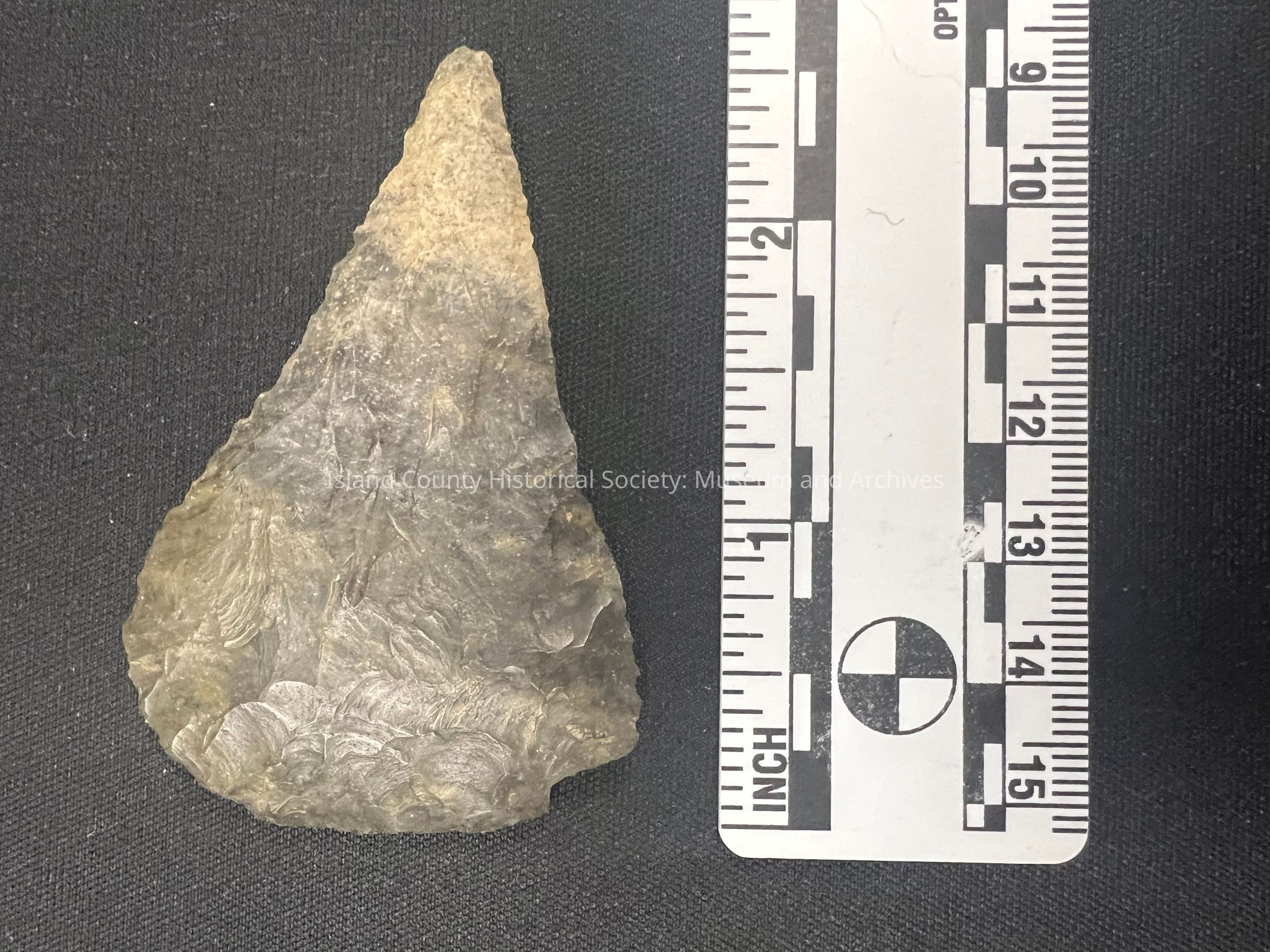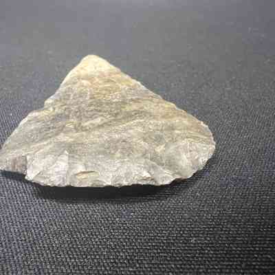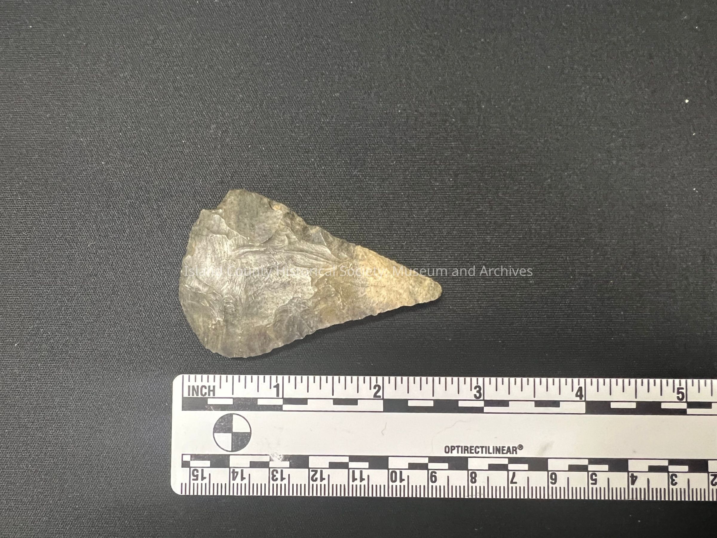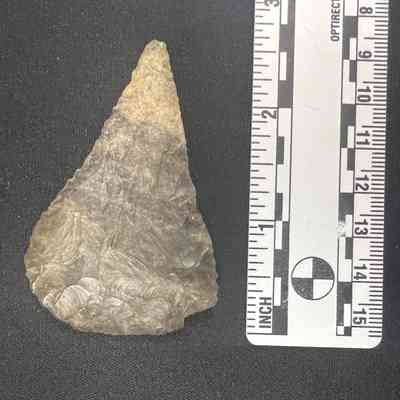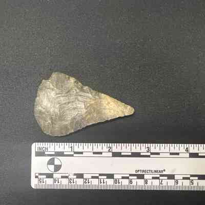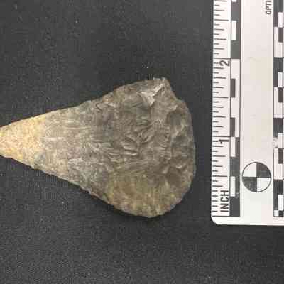 Possibly Colombia River, mottled gray, a scraper due to sharpened wide edge on one side, spine is left on, no notches (corner is broken).Collection