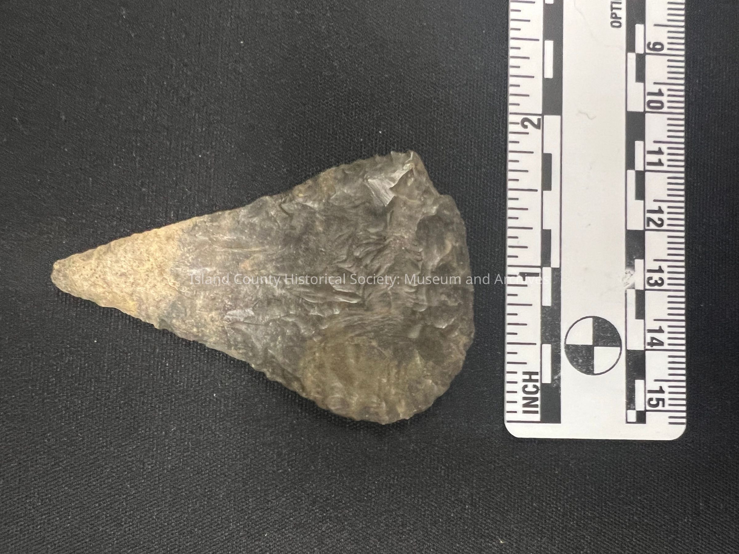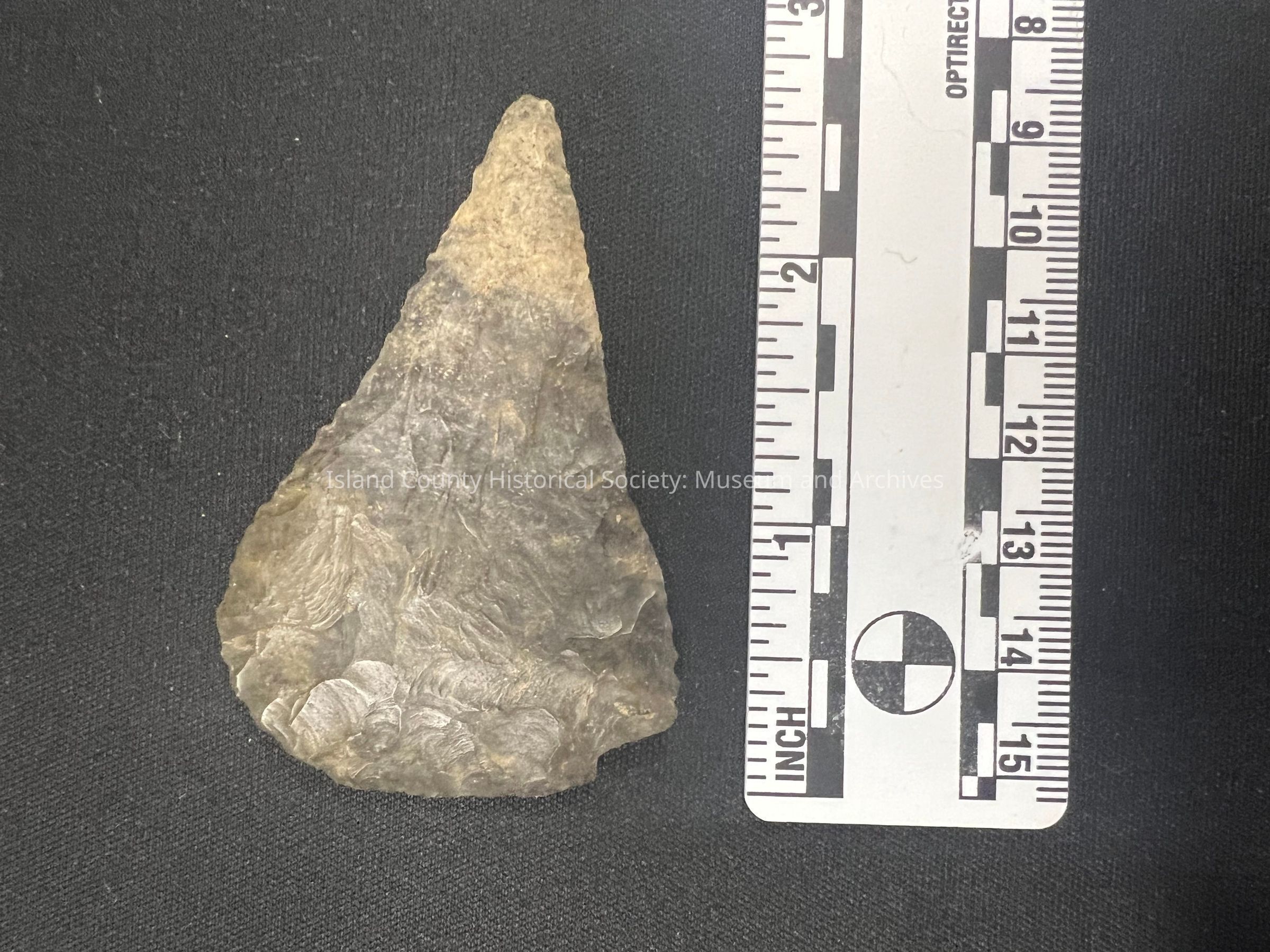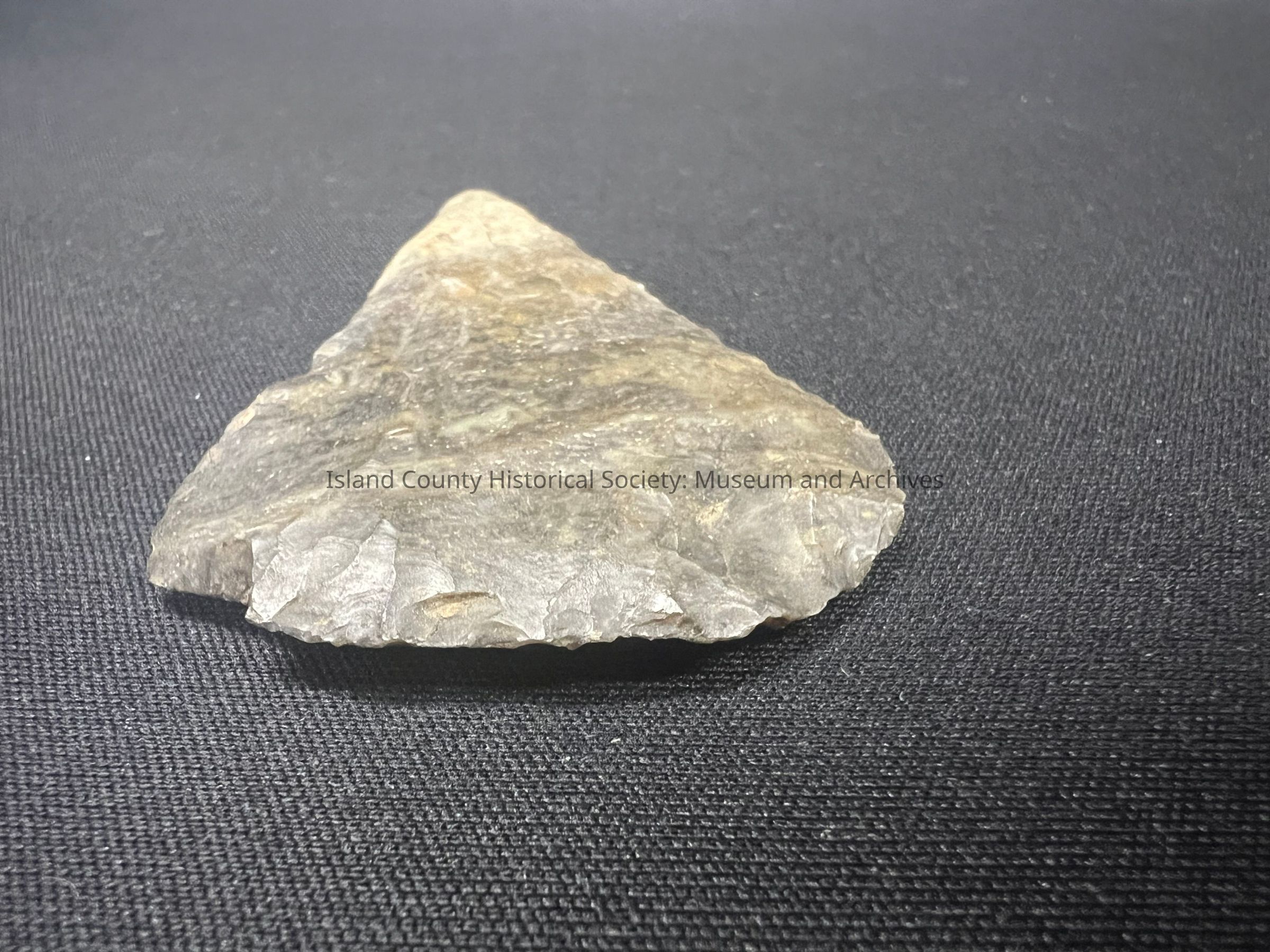 Possibly Colombia River, mottled gray, a scraper due to sharpened wide edge on one side, spine is left on, no notches (corner is broken).Collection