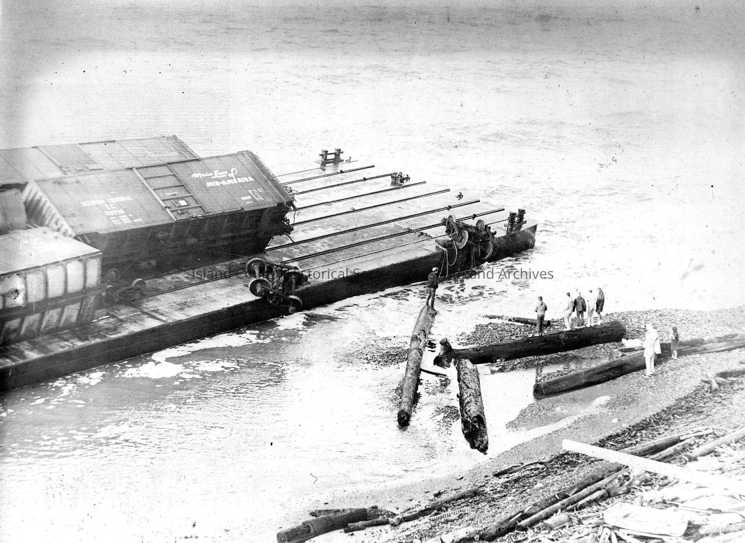 Sepia print of beach scene with freight cars on a barge and men on beach.