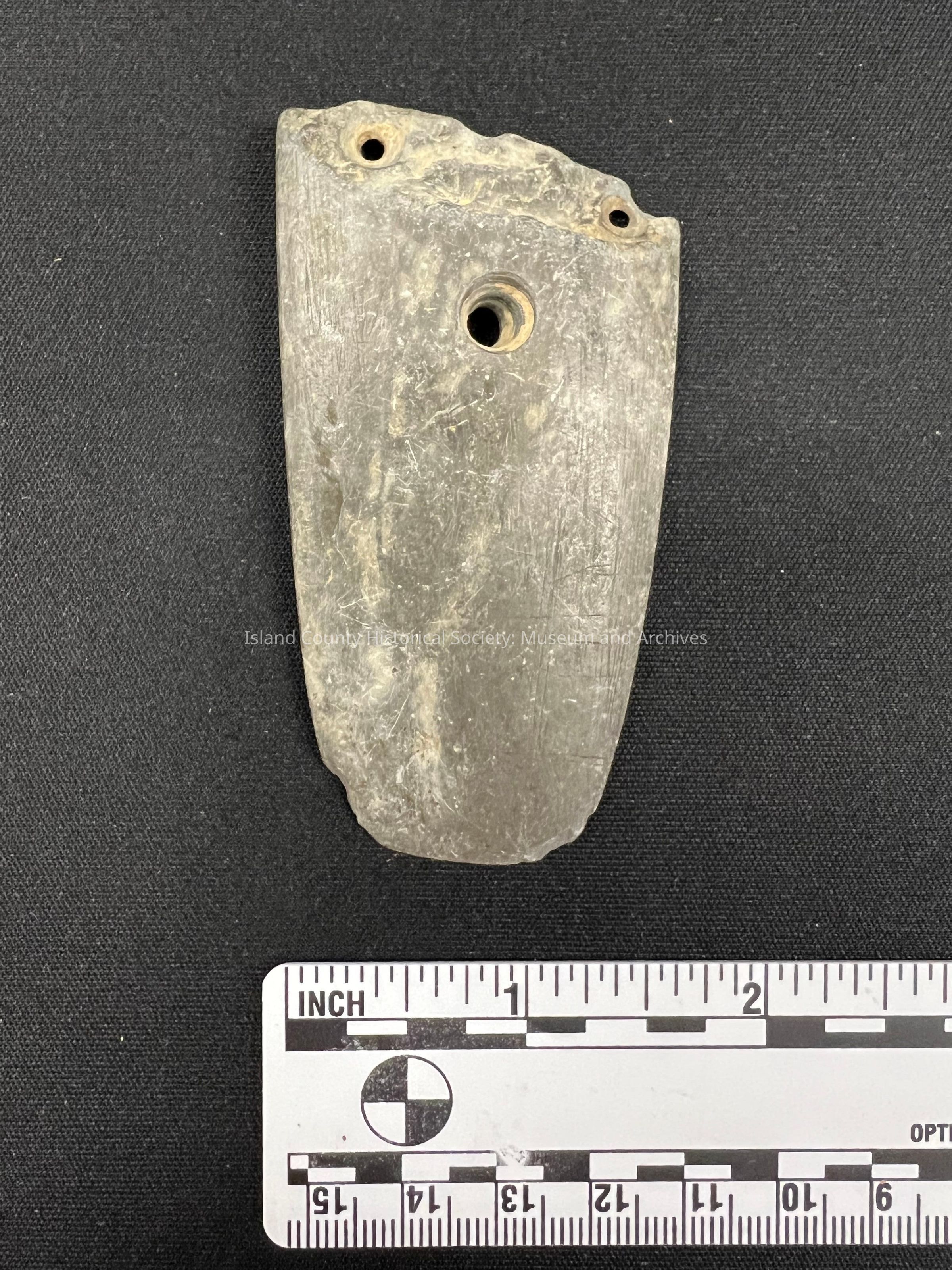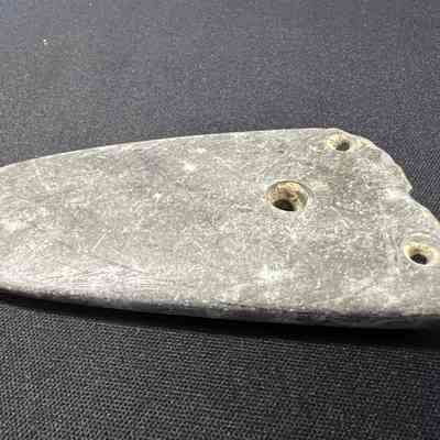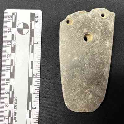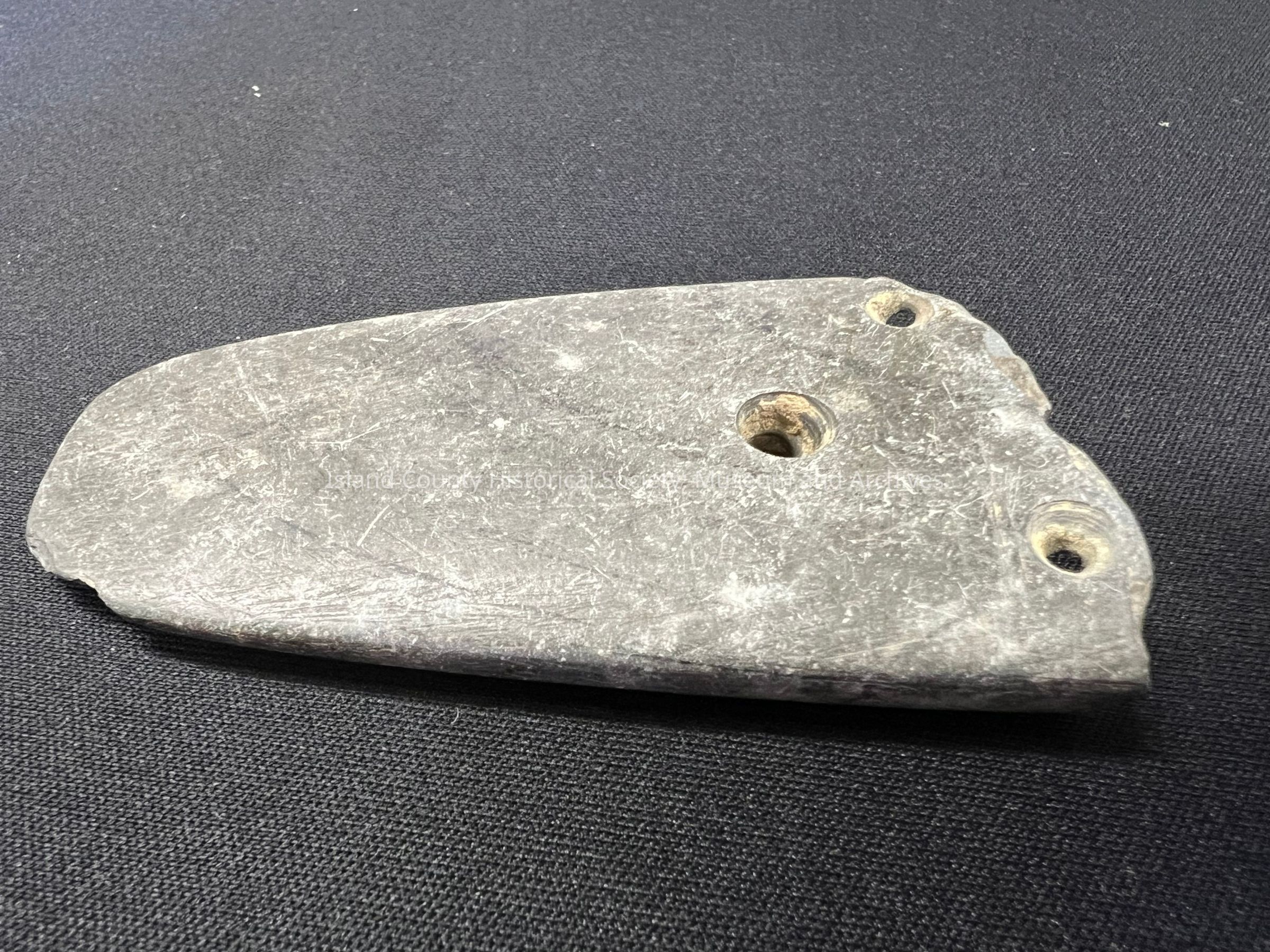 Second gorget with three drilled holes, possibly local material.