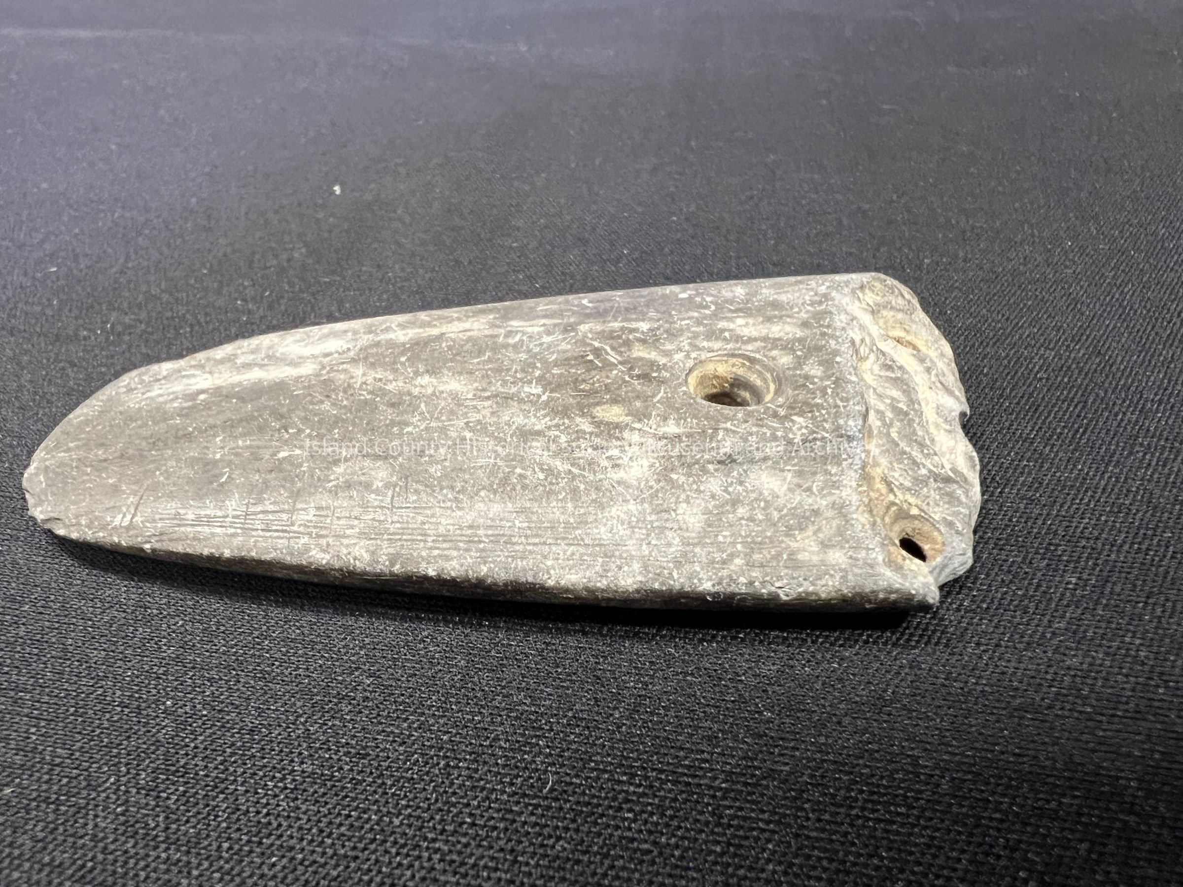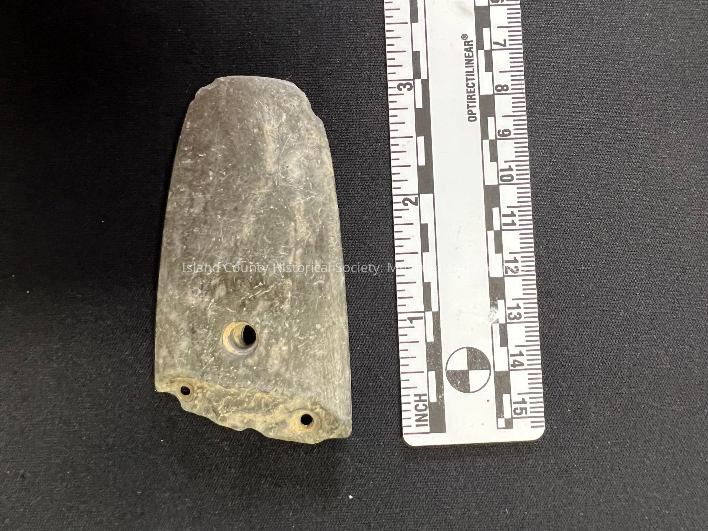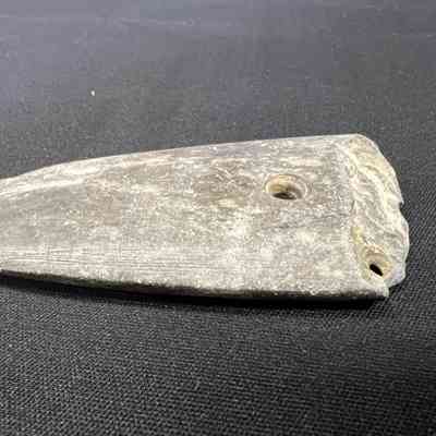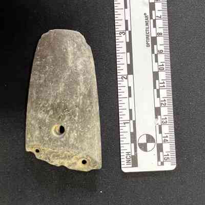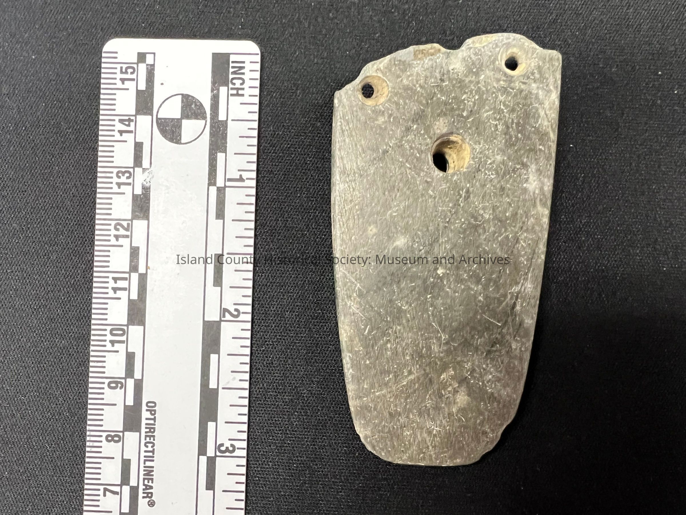 Second gorget with three drilled holes, possibly local material.