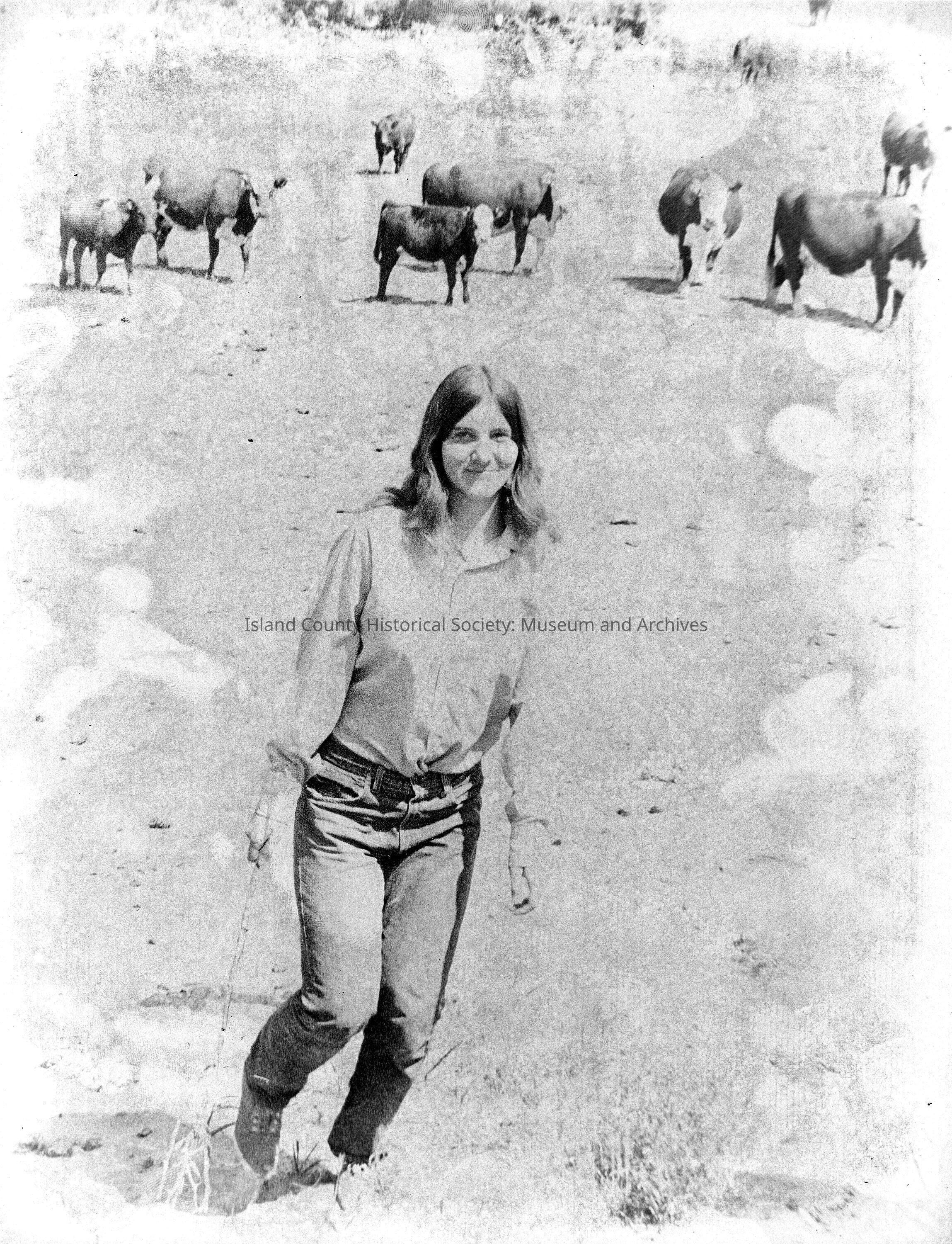 Peggy Darst in field with Herfords