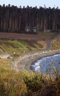 Photograph of Ebey's Landing and dense tree line, obscuring two buildings.Photograph Details